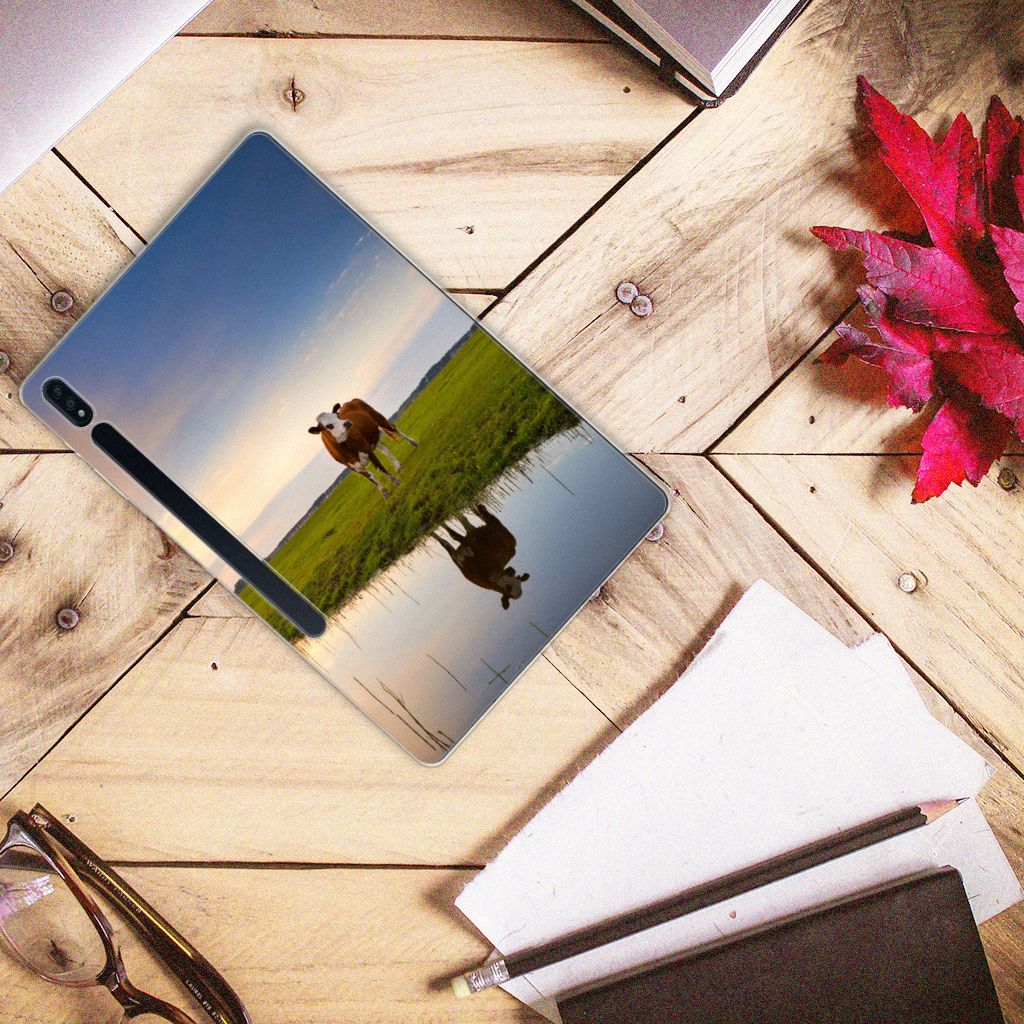 Het levert een idyllisch plaatje op, dit hoesje met een koe en ondergaande zon op de achtergrond. Door een koe buiten te laten lopen en grazen, hebben ze minder kans om ziek te worden. De Koe graast het liefst met soortgenoten, al zijn deze een stukje van de koe op de case verwijderd. Dit levert ook een mooi plaatje op, zoals je kunt zien op dit design hoesje. Dit hoesje met koeien ziet er flexibel uit en is voorzien van alle uitsparingen. Een Samsung Galaxy Tab S7 Plus | S8 Plus Back Case met koeien beschermt jouw tablet vooral aan de achterkant en zijkanten. De zijkanten blijven transparant, de rest van het hoesje is bedrukt. Koeien herkauwen het liefst liggend, behalve wanneer het regent. Zo goed als grazen voelt voor koeien, zo duurzaam zal jouw tablet blijven met dit design hoesje. Het materiaal van het hoesje is schokabsorberend en niet te breken. Dit hoesje past altijd in je tas.