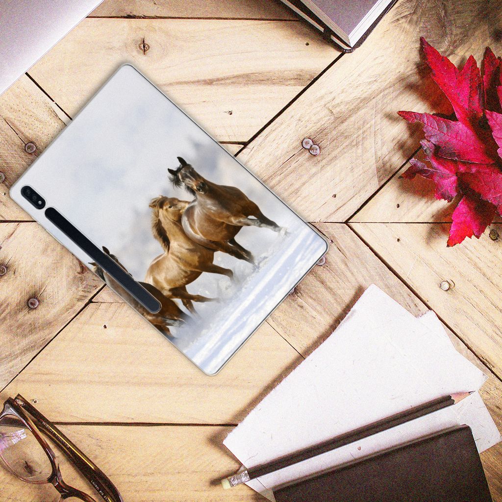 Voor de paardenliefhebbers onder ons hebben we onze collectie uitgebreid met dit design hoesje met print van paarden. Vroeger hield de mens vooral werkpaarden, inmiddels hebben we vriendschap gesloten met het paard. Vandaar dat het ook een favoriet dier is op onze tablethoesjes, zoals deze tabletcase. Een Back Case voor de Samsung Galaxy Tab S7 Plus | S8 Plus met Paarden is niet alleen super mooi en chique, maar ook nog eens zeer flexibel. Verder is de case schokabsorberend en heeft het opstaande randen. Zie je liever je eigen paard terug op een hoesje. Dat kan! Door zelf een uniek hoesje te ontwerpen, met eigen foto’s en teksten. Dit hoesje wordt aan de bovenzijde bedrukt, de zijkanten blijven transparant.