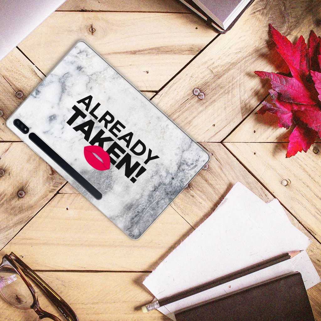 Stel dat je opdringende vrouwen of mannen van je af wil schudden op het moment dat je aan het feesten bent, omdat je al een partner hebt. Dan kun je dat met dit hoesje uitstekend duidelijk maken. Je Samsung Galaxy Tab S7 Plus | S8 Plus neem je waarschijnlijk vaak ter hand, dus dan zal de boodschap als je over dit hoesje beschikt zeker weten overkomen. Ook in het openbaar vervoer zal dit hoesje ervoor zorgen dat je minder snel versierd wordt door het andere geslacht. Als je vrijgezel bent en op zoek naar gezelschap, dan kun je beter kiezen voor een ander hoesje uit ons ruime en gevarieerde assortiment. Het design Already Taken White staat op een Back cover met naam. Dit hoesje wordt alleen aan de bovenkant bedrukt en is zeer flexibel. De randen van het hoesje blijven transparant.