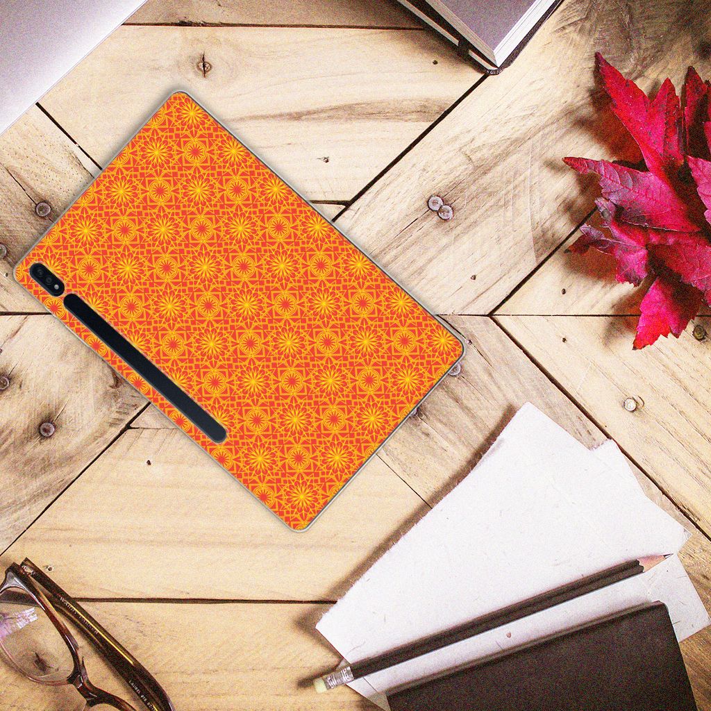 Batikken is een super oude kunstvorm. Met deze methode wordt een geweven stof met verf gedecoreerd. Er zijn stoffen gevonden in het Midden-Oosten en Azië van meer dan tweeduizend jaar oud. Wie had kunnen bedenken dat we zo’n mooie batik-print duizenden jaren later zelfs op tablethoesjes zouden terugvinden? Dit Hippe Hoes in voor je Samsung Galaxy Tab S7 Plus | S8 Plus heeft een mooie oranje kleur en een prachtig symmetrisch patroon. Vanwege de felle kleurtjes is dit hoesje onwijs vrolijk. Maar het belangrijkste van alles: met deze hoes is je tablet altijd beschermd tegen krassen en beschadigingen. Deze batik orange-hoes is niet alleen super mooi en chique, maar ook nog eens zeer flexibel. Verder is de case schokabsorberend en heeft hij opstaande randen.