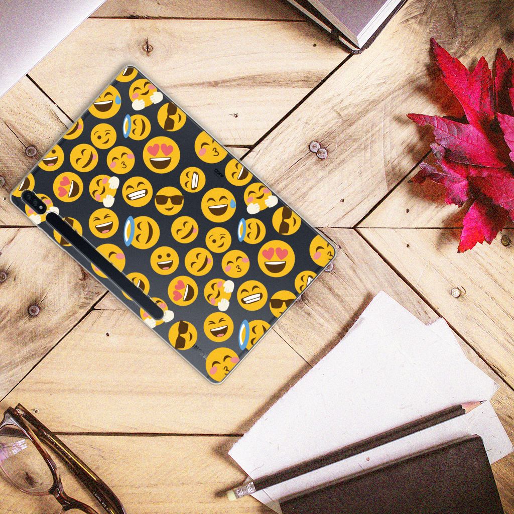 Je gebruikt ze waarschijnlijk dagelijks: emoji’s. Daarom hebben we besloten ze op een design hoesje te zetten. De kleurrijke, vaak gele emoticons maken chatberichten net wat spontaner. Dat hebben we allemaal te danken aan Japan, waar de emoji’s die we zo goed kennen vandaan komen. Ondertussen zijn er meer dan 1800! Deze passen natuurlijk niet allemaal op een Samsung Galaxy Tab S7 Plus | S8 Plus Hippe Hoes, maar we hebben de meeste gebruikte exemplaren erop gezet. Deze tabletcase is voorzien van opstaande randen zodat het touchscreen van je tablet beter is beschermd. Super handig. Het hoesje zelf is zeer flexibel en is op maat gemaakt. We gebruiken emoji’s vaak om complete woorden te vervangen. Dit tablethoesje zegt dan ook meer dan duizend woorden kunnen. Deze case wordt alleen aan de bovenzijde bedrukt met emoji’s. De zijkanten van de case worden niet bedrukt en blijven transparant.