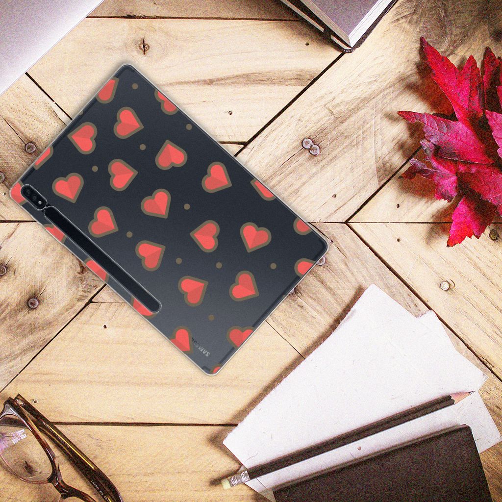 Met deze Samsung Galaxy Tab S7 Plus | S8 Plus Hippe Hoes met hartjes op een grijs met witte achtergrond maak jij een goede beurt als je dit cadeau geeft aan je vriend of vriendin. Bekroon je liefde voor elkaar met deze hele mooie rabletcase, die jouw tablet met name aan de achterkant en zijkanten goed beschermt. Dit is echt een prachtige manier om je tablet te beschermen. Het hoesje met design met Hearts is ook nog eens zeer praktisch, mede door het buigzame materiaal en de uitsparingen. Als je tablet met het hoesje uit je hand valt, stuitert het als het ware meteen weer terug in je hand en zal het scherm in tact blijven. De case heeft namelijk opstaande randen aan de voorkant. Alleen de bovenkant van de case wordt bedrukt met hartjes, de zijkanten zijn doorzichtig. Voor een habbekrats is dit hoesje met hartjes op een grijs met witte achtergrond te bestellen.