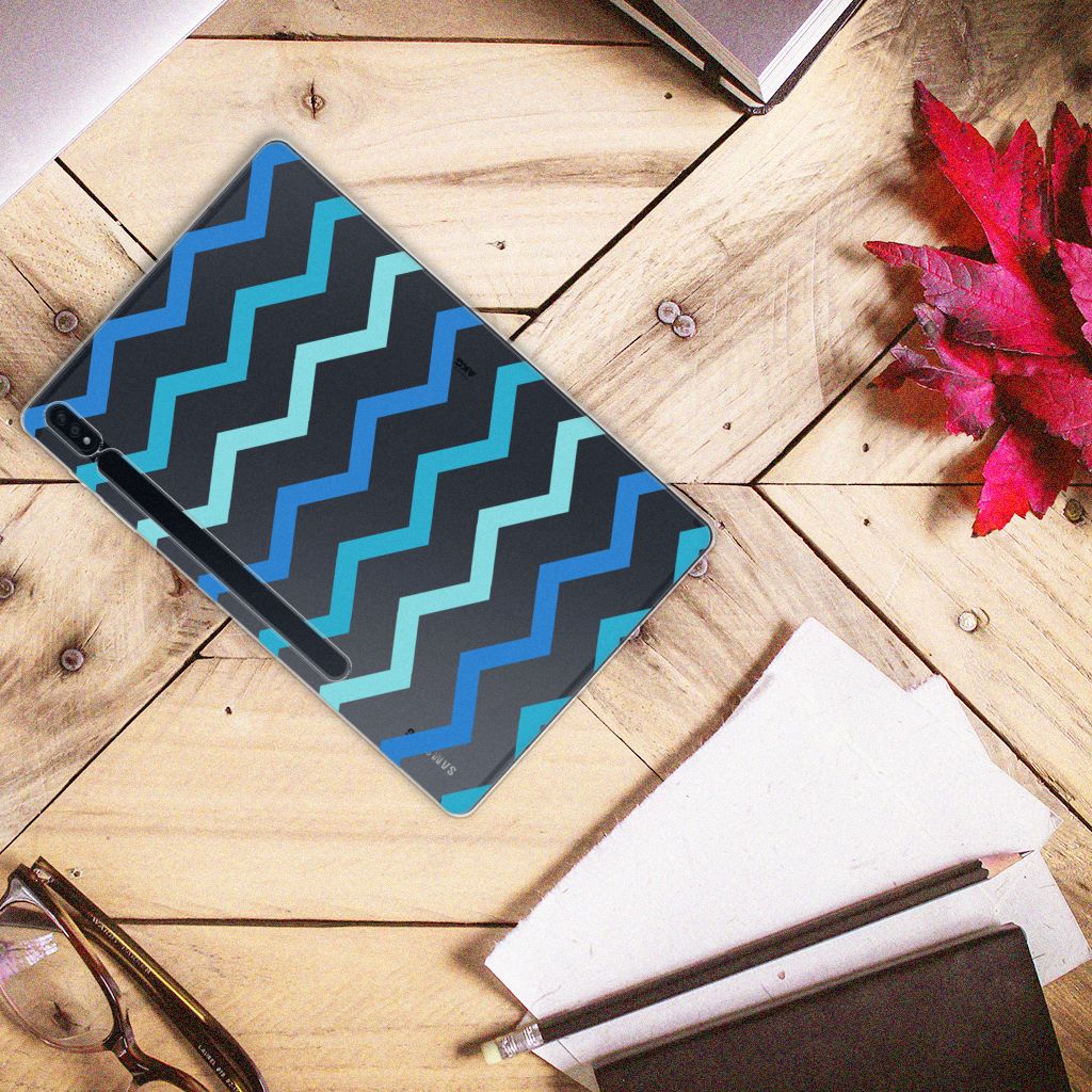Dit zigzag blauwe design hoesje is speciaal ontworpen voor jou. We hebben bewust verschillende stijlen blauw gebruikt, zodat er voldoende sprake is van variatie. Dit blauwwitte Hippe Hoes ziet er super strak uit. Dat kan ook niet anders, als je weet dat onze zeer talentvolle designer er hoogstpersoonlijk voor verantwoordelijk is. Hij schudt wekelijks nieuwe designs uit zijn mouw en dit zigzag blauwe hoesje is een van zijn fraaiste creaties. Een heel dik design hoesje, al zeggen we het zelf. Valt dit blauwwitte design hoesje goed bij jou? Bestel het dan vandaag nog en je hebt het morgen in huis. Het design staat op een TPU tabletcase. Dit hoesje wordt alleen aan de bovenkant bedrukt en is zeer flexibel. De randen van het hoesje blijven transparant en worden niet bedrukt. Met dit hoesje past jouw Samsung Galaxy Tab S7 Plus | S8 Plus altijd in je tas.