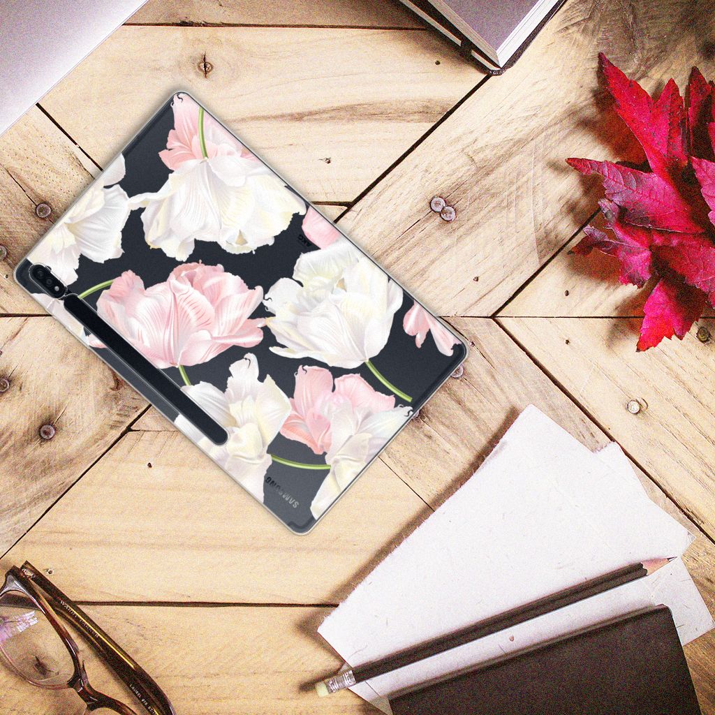 Een bosje bloemen doet een mens (en zijn tablet) goed. De witte en roze bloemen op deze Samsung Galaxy Tab S7 Plus | S8 Plus Siliconen Hoesje geven jouw tablet een zeer mooie uitstraling. Je wordt er ook meteen een stuk rustiger van als je aan het appen of aan het bellen bent. Valt dan je tablet op de grond, dan zal er dankzij deze case met het design Lovely Flowers ontstaan. Helemaal niet als je er een screenprotector bij hebt gekocht. Onze hoesjes met roze en witte bloemen zien er zeer prettig uit en zijn heel praktisch, getuige onder meer de opstaande randen en het flexibele materiaal. Alleen de achterkant van het hoesje wordt bedrukt met roze en witte bloemen en de randen blijven transparant.