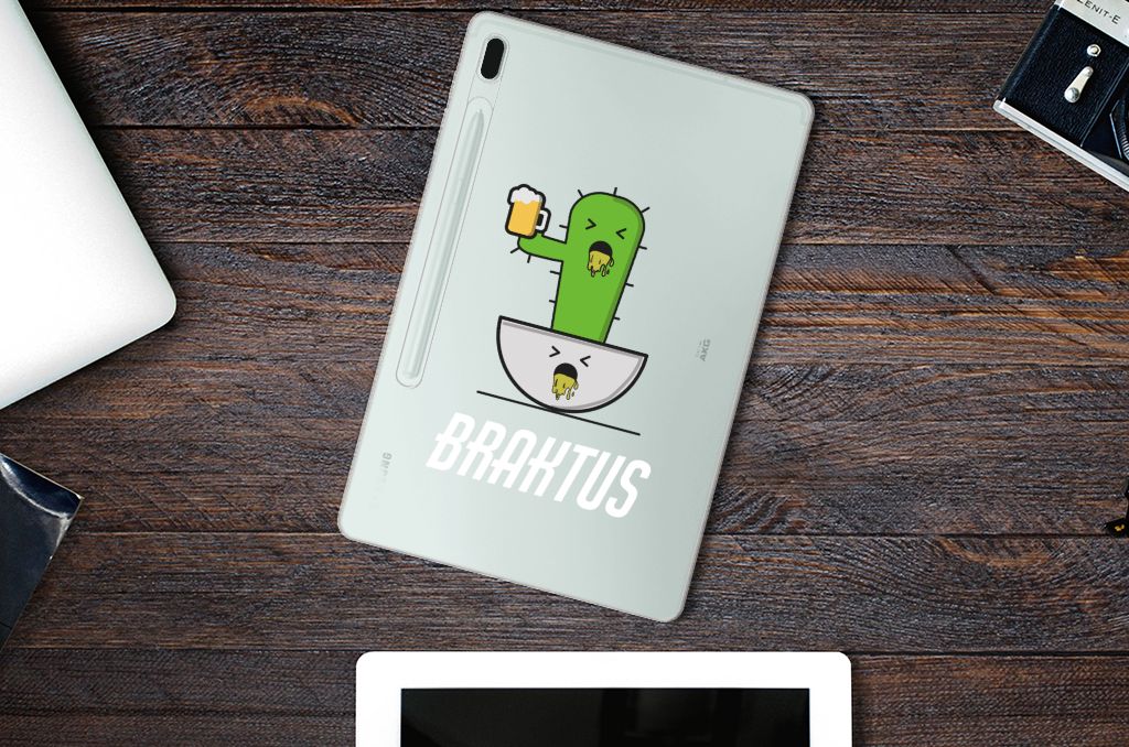 Voor de stappers onder ons hebben we dit hele grappige hoesje ontworpen. Deze Braktus case geeft perfect het gevoel weer als jij in de ochtend wakker wordt na een weekendje carnaval vieren: duf en waardeloos. Hopelijk was dit het wel waard en heb je een gezellige tijd gehad. Als aandenken zou je deze Tablet Back Cover met cactus print kunnen bestellen. Deze design case beschermt jouw Samsung Galaxy Tab S7FE vooral aan de achterkant en zijkanten, het scherm blijft deels onbeschermd. Verder heeft het tablethoesje opstaande randen, zodat het toestel bij een val de grond niet direct raakt. Een handig en flexibel hoesje, dat altijd in je tas past. Bescherming heb je met carnaval natuurlijk wel nodig, want tijdens het hossen kan de tablet zomaar uit je outfit vallen. Bestel daarom deze tabletcase, gemaakt van schokabsorberend materiaal. Alleen de bovenkant van de case wordt bedrukt en de randen blijven transparant.