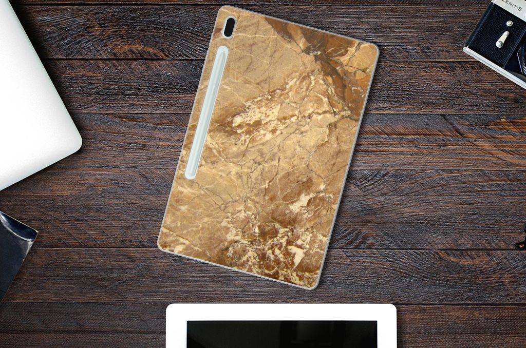 Dit design hoesje met Marmer in lichtbruine kleur is voor de artistiekelingen onder ons. De Grieken en Romeinen wisten het marmer al te waarderen door het in de bouw toe te passen. Naast het witte marmer zijn de diverse soorten marmer in een gevarieerde kleurensamenstelling te krijgen. We hebben verschillende mooie kleuren op design hoesjes gezet, zoals in dit geval het lichtbruine marmer. Dit is een Samsung Galaxy Tab S7FE Tablet Back Cover met marmer in lichtbruine kleur. Het marmer wordt bedrukt op de voorkant van het hoesje, dat beschikt over opstaande randen aan de voorkant en heel goed combineert met een screenprotector van glas of van folie.