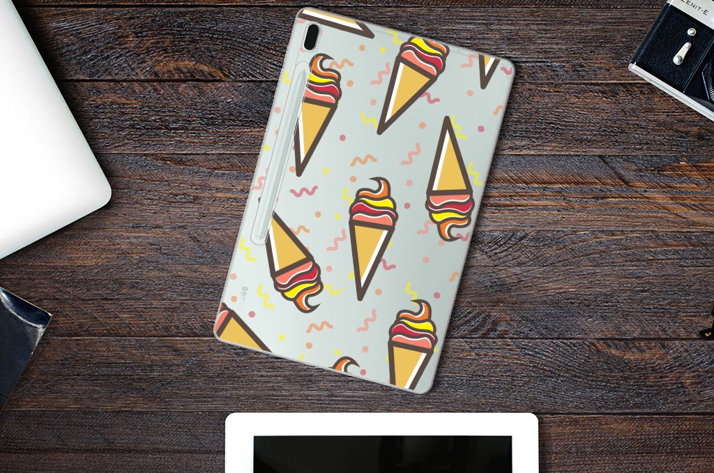 Een vrolijke Samsung Galaxy Tab S7FE Tablet Cover met daarop verschillende ijsjes. Als je daar geen zomers gevoel meer van krijgt, weten wij het ook niet meer. De zomer en ijsjes zijn onlosmakelijk met elkaar verbonden. Tijdens een bezoekje aan het strand mag een lekker ijsje bijvoorbeeld niet ontbreken. Een design hoesje met lekkere ijsjes print past daar natuurlijk ook ontzettend goed bij. Jouw tablet is goed beschermd met deze case met Icecream design. De aankoop van deze case is een heerlijke investering, die zich gegarandeerd terugbetaalt. De bovenkant van dit hoesje wordt bedrukt met ijsjes, de zijkanten blijven doorzichtig. De case is gemaakt van schokabsorberend materiaal en past altijd in je tas. Onder alle weersomstandigheden zal deze tabletcase perfect functioneren, ook in de zomer met een ijsje in je hand. Dit smaakvolle hoesje is zeer goedkoop te bestellen en wordt zeer snel bezorgd.