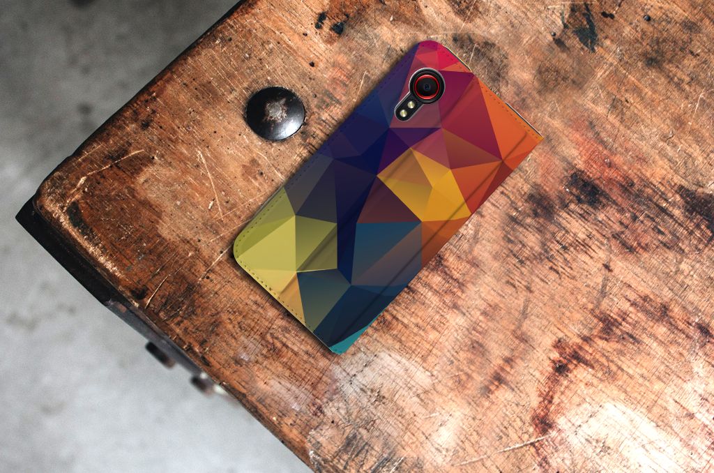 Veelkleurige driehoeken die samen eindeloze asymmetrische patronen lijken te vormen. Het is het abstracte schouwspel dat op dit fraaie hoesje voor je Samsung Galaxy Xcover 5 direct de aandacht trekt noemen we voor het gemak trekt noemen we voor het gemak Polygon Color. De een ziet er een berglandschap in, de ander piramides. Wat zie jij erin? Zeker is in elk geval dat de aanblik van dit fascinerende ontwerp je niet snel gaat vervelen. Het kleurige spel van lijnen en vlakken blijft eindeloos boeien en geeft jouw Stand Case een hippe en kunstzinnige uitstraling. De kracht die het lijnenspel uitstraalt, komt ook terug in het hoesje zelf. De solide hoes van PU-leer beschikt ook over een 1 pashouder en een speciale standaard. Het hoesje wordt afgesloten met een magneet aan de binnenzijde. De houder aan de binnenzijde is van TPU. Alle zijden worden bedrukt.
