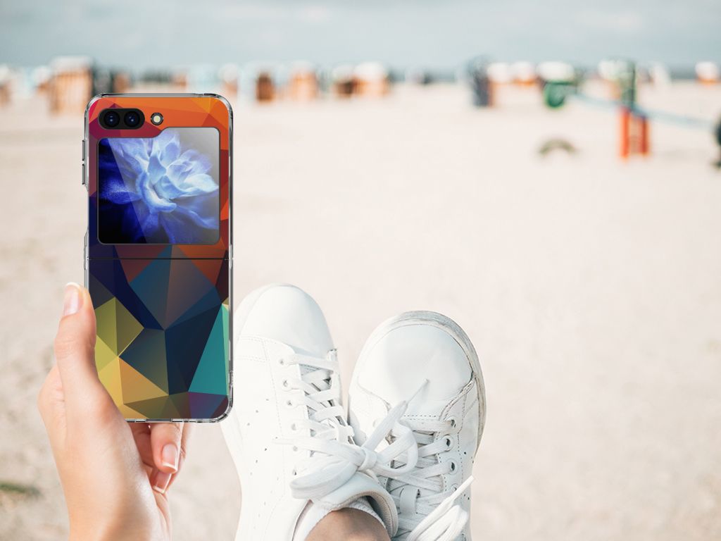 Veelkleurige driehoeken die samen eindeloze asymmetrische patronen lijken te vormen. Het is het abstracte schouwspel dat op dit fraaie hoesje voor je Samsung Galaxy Z Flip 5 direct de aandacht trekt noemen we voor het gemak trekt noemen we voor het gemak Polygon Color. De een ziet er een berglandschap in, de ander piramides. Wat zie jij erin? Zeker is in elk geval dat de aanblik van dit fascinerende ontwerp je niet snel gaat vervelen. Het kleurige spel van lijnen en vlakken blijft eindeloos boeien en geeft jouw TPU Hoesje een hippe en kunstzinnige uitstraling. De kracht die het lijnenspel uitstraalt, komt ook terug in het hoesje zelf. Dit hoesje wordt alleen aan de bovenkant bedrukt en is zeer flexibel. De randen van het hoesje blijven transparant. Wat wil je nog meer?