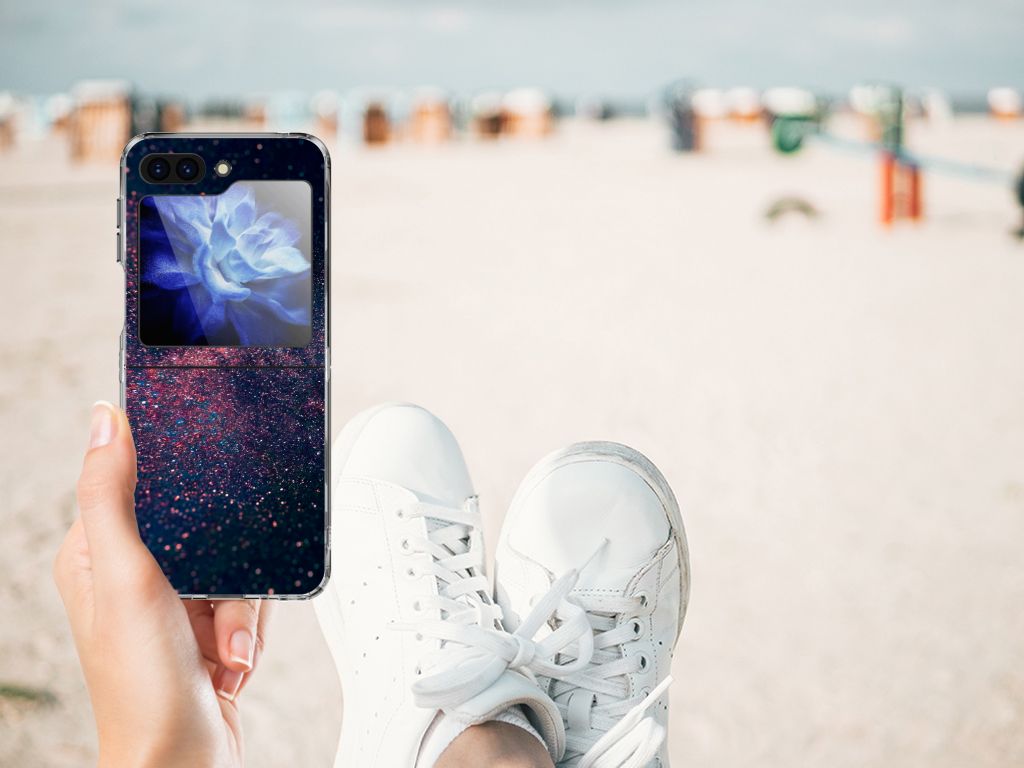 Je waant je in de zevende hemel met dit kunstzinnige, glitterachtige design hoesje met paarse en blauwe kleuren tegen een inktzwarte achtergrond. Het smartphone hoesje heeft ook een wat science fiction achtige allure. Met deze design Stars case zul je zeker opvallen. Als dit je bedoeling is, bestel dat snel dit waanzinnig mooie product voor je Samsung Galaxy Z Flip 5. Het telefoonhoesje is van alle gemakken voorzien en combineert een hele fraaie uitstraling met maximaal comfort. Bovendien is het gemaakt van zeer stevig en flexibel materiaal. Het unieke design, door B2C Telecom ontworpen, staat op een TPU Hoesje. Dit hoesje wordt alleen aan de bovenkant bedrukt en is zeer flexibel. De randen van het hoesje blijven transparant en worden niet bedrukt. Met dit hoesje past jouw telefoon altijd in je broekzak.