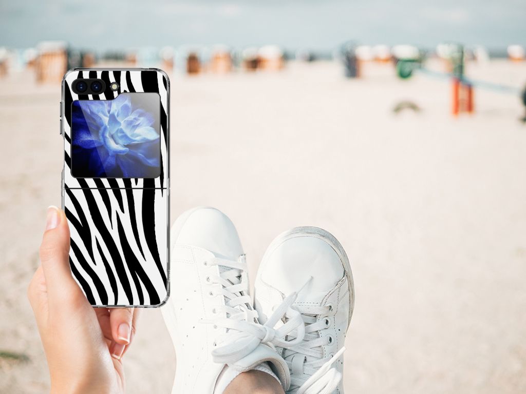 Deze Samsung Galaxy Z Flip 5 TPU Hoesje met zwart en witte zebra strepen kan exclusief in het bezit van jou komen. Zeker als je er zelf nog unieke teksten en/of beelden aan toevoegt van jezelf. Je hoesje krijgt dan een eigen identiteit, net zoals de witte en zwarte strepen uniek zijn bij iedere Zebra. Deze zijn te vergelijken met de vingerafdrukken bij de mens. De strepen en patronen zijn nooit identiek aan die van een andere zebra. Ben jij toe aan een uniek tpu case? Pak dan dit design met zebra strepen als basis. Het tpu hoesje is zeer flexibel en wordt alleen aan de bovenzijde bedrukt. De randen van dit flexibele hoesje blijven doorzichtig. Een zebra gebruikt de strepen ook om zich te camoufleren in de omgeving om zo uit het zicht te blijven van de roofdieren. Jij zorgt voor de perfecte bescherming van je smartphone met dit design hoesje in zebra kleuren.