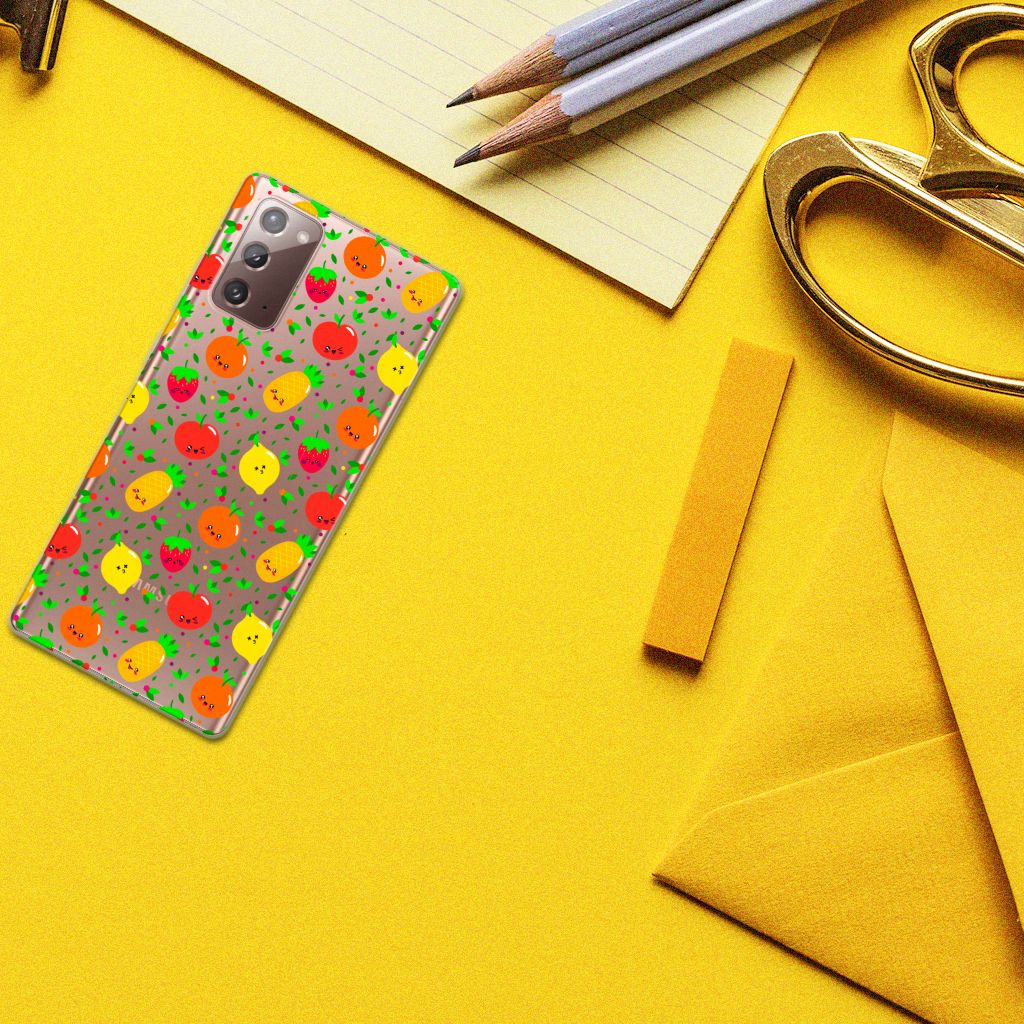 Een fris, fruitig en vrolijk hoesje, deze case met afbeeldingen van aardbeien, ananassen, appels, sinaasappels en citroenen. Minstens twee stuks fruit per dag wordt aanbevolen als dagelijkse hoeveelheid voor de mens. Dit verkleint de kans op allerlei ziekten. Dus met het aantal stukken fruit op de Samsung Note 20 Siliconen Case zou je wel een maandje zoet moeten zijn. Met het hoesje zelf kun je je hele leven doen, dit is namelijk niet stuk te krijgen. Dit komt door het sterke en flexibele materiaal waarvan het gemaakt is. De vrolijk stemmende case het desing Fruits maakt jouw telefoon dus zeer duurzaam. Zorg ervoor dat jouw smartphone gezond blijft en kies voor dit hoesje met frivool fruit. Een tpu case met fruit wordt alleen aan de bovenkant bedrukt en is zeer flexibel. De randen van het hoesje blijven transparant en worden niet bedrukt met het fruit.