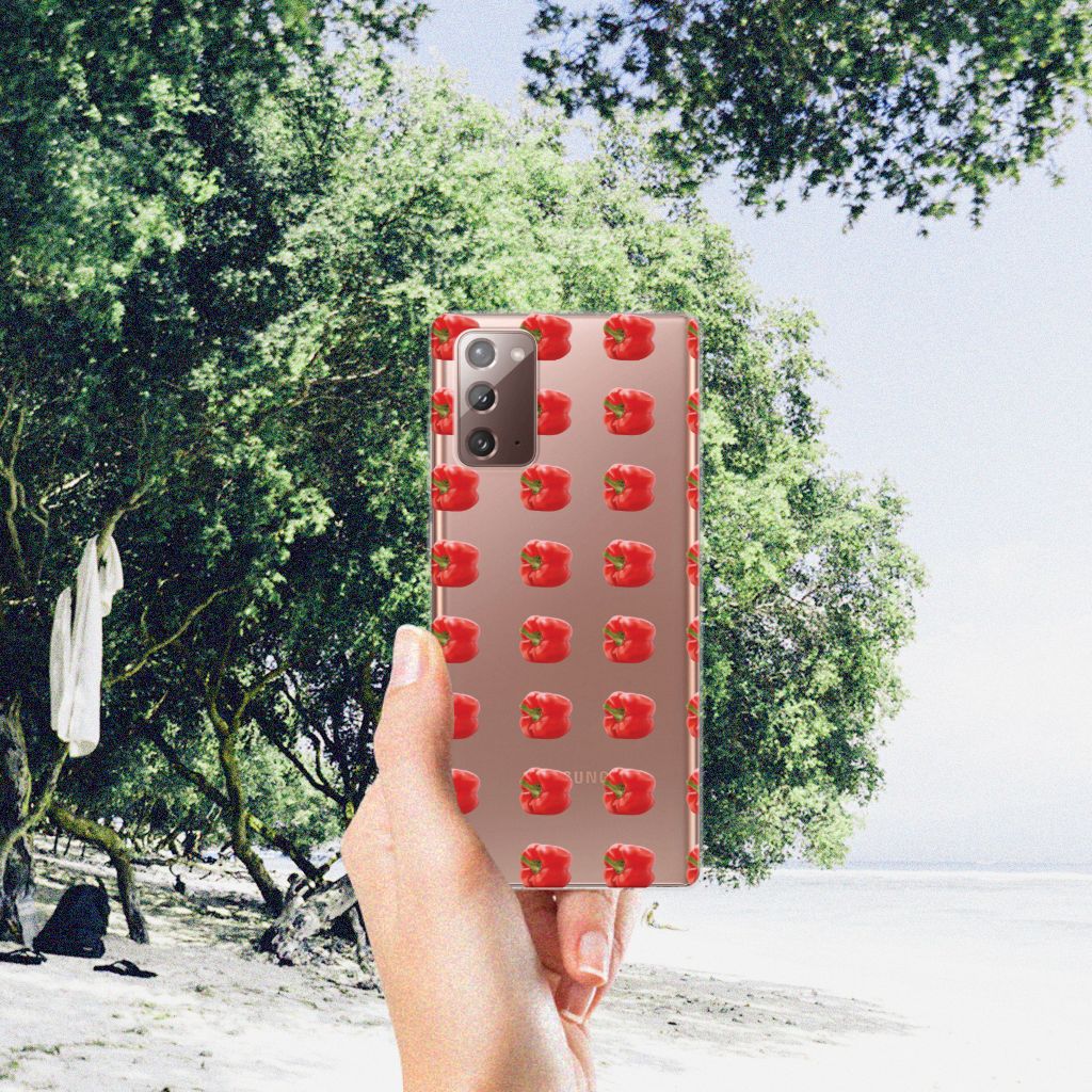 Er zit pit in jouw Samsung Note 20 Siliconen Case dankzij dit design met rode paprika’s. Paprika’s zijn er in allerlei kleuren en vormen en ze hebben gemeen dat ze heel erg gezond zijn. De rode paprika’s op deze case staan op een grijs met witte geblokte achtergrond en vormen een opvallende verschijning. Heb jij ooit iemand in je nabije omgeving rond zien lopen met een design hoesje met rode paprika’s? Waarschijnlijk niet. Dit hoesje wordt alleen aan de bovenkant bedrukt met paprika’s en is zeer flexibel. De randen van het hoesje blijven transparant en worden niet bedrukt. Met dit hoesje past jouw telefoon altijd in je broekzak. Zeker weten dat je met dit hoesje met rode paprika’s een smartphone accessoire te pakken hebt waarmee je jezelf in de schijnwerpers zet. Als je andere kleuren paprika’s op je hoesje wilt, raden we je aan ons assortiment design hoesjes te bekijken of zelf een hoesje te ontwerpen.