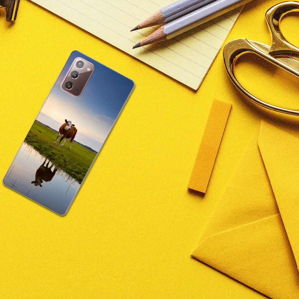 Het levert een idyllisch plaatje op, dit hoesje met een koe en ondergaande zon op de achtergrond. Door een koe buiten te laten lopen en grazen, hebben ze minder kans om ziek te worden. De Koe graast het liefst met soortgenoten, al zijn deze een stukje van de koe op de case verwijderd. Dit levert ook een mooi plaatje op, zoals je kunt zien op dit design hoesje. Dit tpu hoesje met koeien ziet er flexibel uit en is voorzien van alle uitsparingen. Een Samsung Note 20 TPU Hoesje met koeien beschermt jouw smartphone vooral aan de achterkant en zijkanten. De zijkanten blijven transparant, de rest van het hoesje is bedrukt. Koeien herkauwen het liefst liggend, behalve wanneer het regent. Zo goed als grazen voelt voor koeien, zo duurzaam zal jouw smartphone blijven met dit design hoesje. Het TPU is schokabsorberend en niet te breken. De TPU case past altijd in je broekzak.