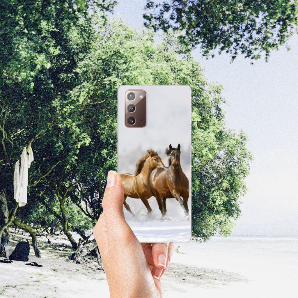 Voor de paardenliefhebbers onder ons hebben we onze collectie uitgebreid met dit design hoesje met print van paarden. Vroeger hield de mens vooral werkpaarden, inmiddels hebben we vriendschap gesloten met het paard. Vandaar dat het ook een favoriet dier is op onze smartphonehoesjes, zoals deze tpu case. Een TPU Hoesje voor de Samsung Note 20 met Paarden is niet alleen super mooi en chique, maar ook nog eens zeer flexibel. Verder is de case schokabsorberend en heeft het opstaande randen. Zie je liever je eigen paard terug op een hoesje. Dat kan! Door zelf een uniek hoesje te ontwerpen, met eigen foto’s en teksten. De TPU case wordt aan de bovenzijde bedrukt, de zijkanten blijven transparant.