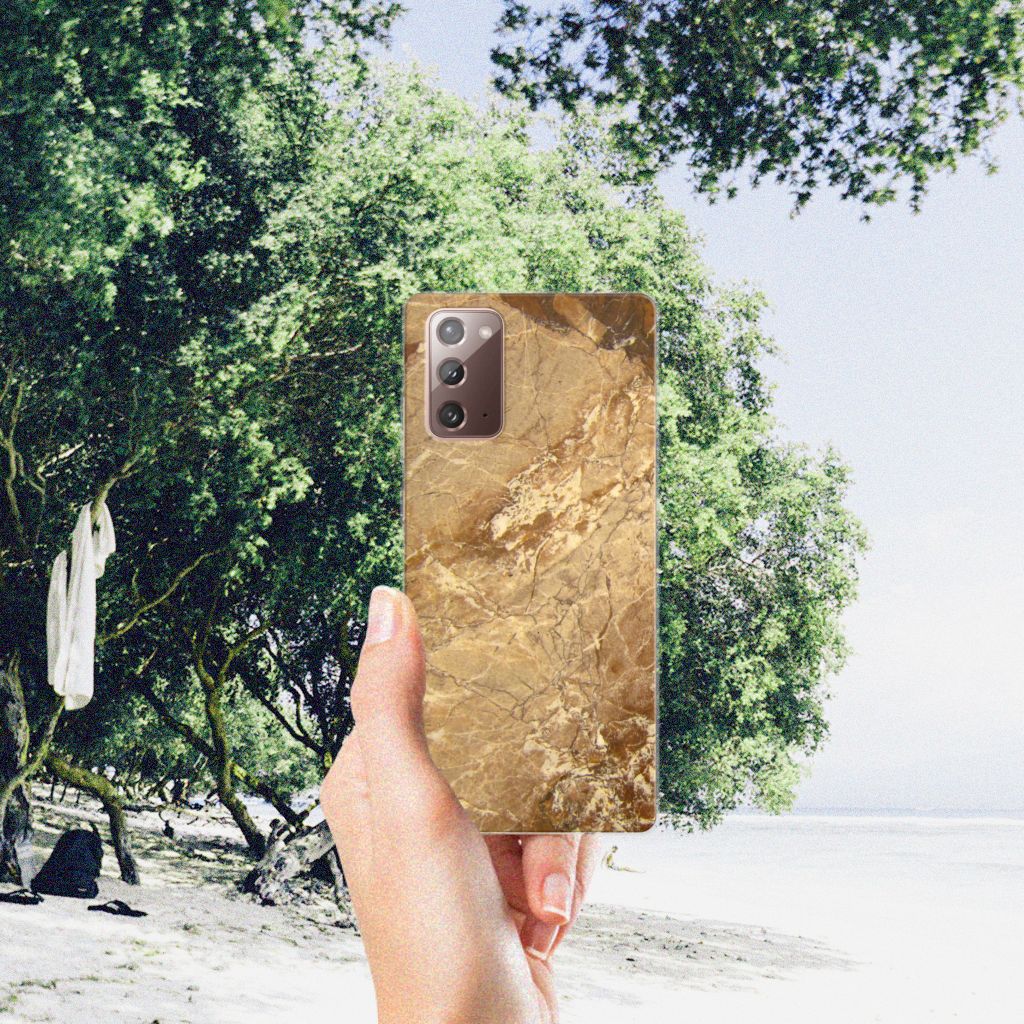 Dit design hoesje met Marmer in lichtbruine kleur is voor de artistiekelingen onder ons. De Grieken en Romeinen wisten het marmer al te waarderen door het in de bouw toe te passen. Naast het witte marmer zijn de diverse soorten marmer in een gevarieerde kleurensamenstelling te krijgen. We hebben verschillende mooie kleuren op design hoesjes gezet, zoals in dit geval het lichtbruine marmer. Dit is een Samsung Note 20 TPU Siliconen Hoesje met marmer in lichtbruine kleur. Het marmer wordt bedrukt op de voorkant van een tpu case, die beschikt over opstaande randen aan de voorkant en heel goed combineert met een screenprotector van glas of van folie. Door de rijkdom aan kleuren en varianties in afwerking kunnen ontwerpers met marmer schitterende architectonische projecten realiseren. Wij hebben hetzelfde gedaan en onze ontwerper veel vrijheid geboden. Het resultaat zie je terug in deze tpu case met lichtbruin marmer, die jouw smartphone goed beschermt. De zijkanten van de case worden niet bedrukt met het lichtbruine marmer.