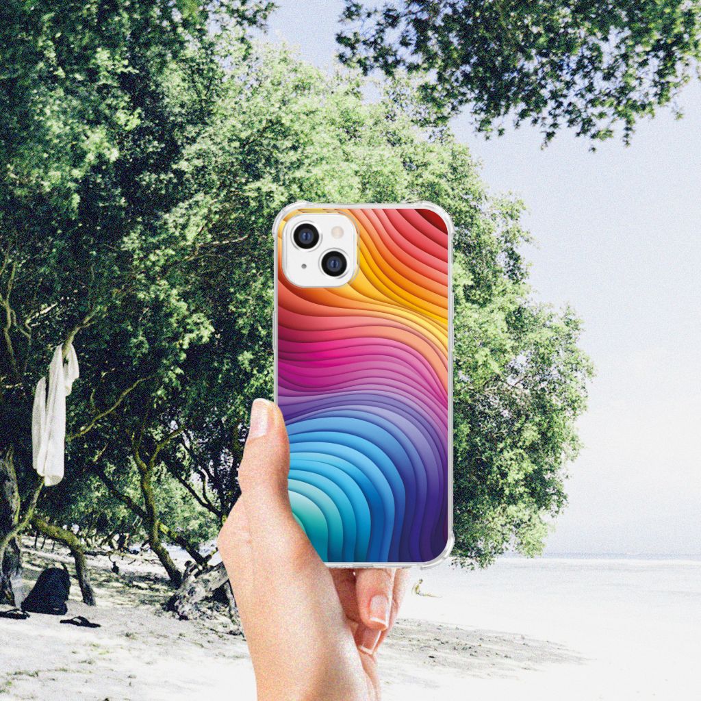 Een regenboog bestaat eigenlijk uit meer dan zeven kleuren, wist je dat? De zichtbare kleuren vloeien geleidelijk in elkaar over, waardoor er eigenlijk meer dan zeven kleuren zijn. Dat wij maar zeven ‘’stroken’’ licht zien, is dus eigenlijk gezichtsbedrog. Toch noemen wij dit hoesje regenboog, omdat wij er blij van worden! Dit design wordt geprint op een Shockproof Case speciaal op maat gemaakt voor de Apple iPhone 14 Plus. Ook fijn zijn de extra dikke hoeken en randen, waardoor je smartphone goed beschermd is bij een val. Alleen de achterkant van je telefoon wordt beschermd. Daarom adviseren wij om dit hoesje in combinatie met een screenprotector te gebruiken. Bestel vandaag nog dit telefoonhoesje met regenboog design!