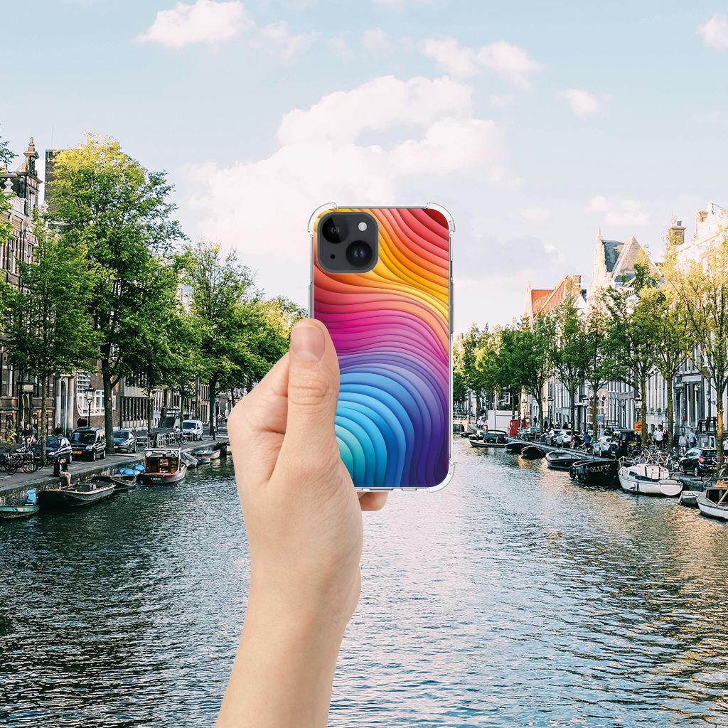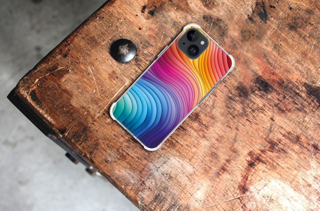Een regenboog bestaat eigenlijk uit meer dan zeven kleuren, wist je dat? De zichtbare kleuren vloeien geleidelijk in elkaar over, waardoor er eigenlijk meer dan zeven kleuren zijn. Dat wij maar zeven ‘’stroken’’ licht zien, is dus eigenlijk gezichtsbedrog. Toch noemen wij dit hoesje regenboog, omdat wij er blij van worden! Dit design wordt geprint op een Shockproof Case speciaal op maat gemaakt voor de iPhone 15. Ook fijn zijn de extra dikke hoeken en randen, waardoor je smartphone goed beschermd is bij een val. Alleen de achterkant van je telefoon wordt beschermd. Daarom adviseren wij om dit hoesje in combinatie met een screenprotector te gebruiken. Bestel vandaag nog dit telefoonhoesje met regenboog design!