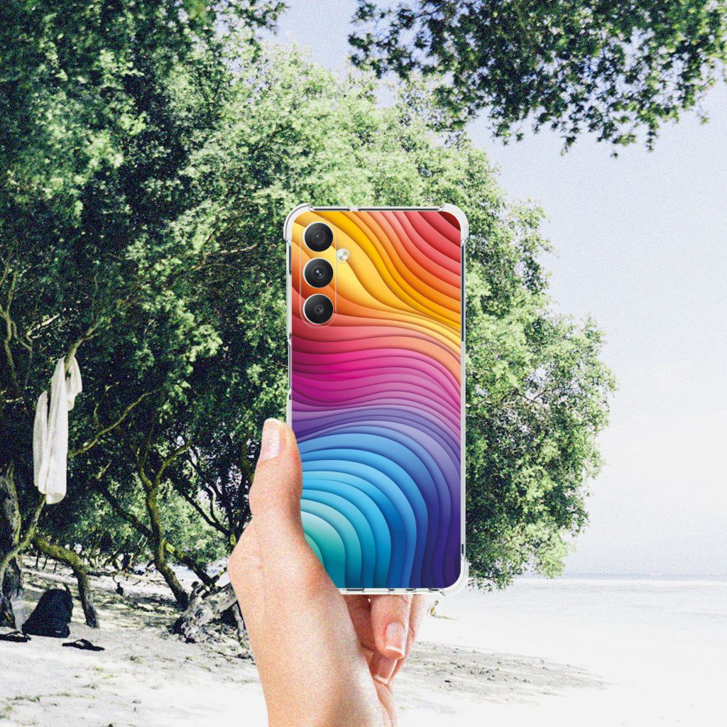 Een regenboog bestaat eigenlijk uit meer dan zeven kleuren, wist je dat? De zichtbare kleuren vloeien geleidelijk in elkaar over, waardoor er eigenlijk meer dan zeven kleuren zijn. Dat wij maar zeven ‘’stroken’’ licht zien, is dus eigenlijk gezichtsbedrog. Toch noemen wij dit hoesje regenboog, omdat wij er blij van worden! Dit design wordt geprint op een Shockproof Case speciaal op maat gemaakt voor de Samsung Galaxy A05s. Ook fijn zijn de extra dikke hoeken en randen, waardoor je smartphone goed beschermd is bij een val. Alleen de achterkant van je telefoon wordt beschermd. Daarom adviseren wij om dit hoesje in combinatie met een screenprotector te gebruiken. Bestel vandaag nog dit telefoonhoesje met regenboog design!