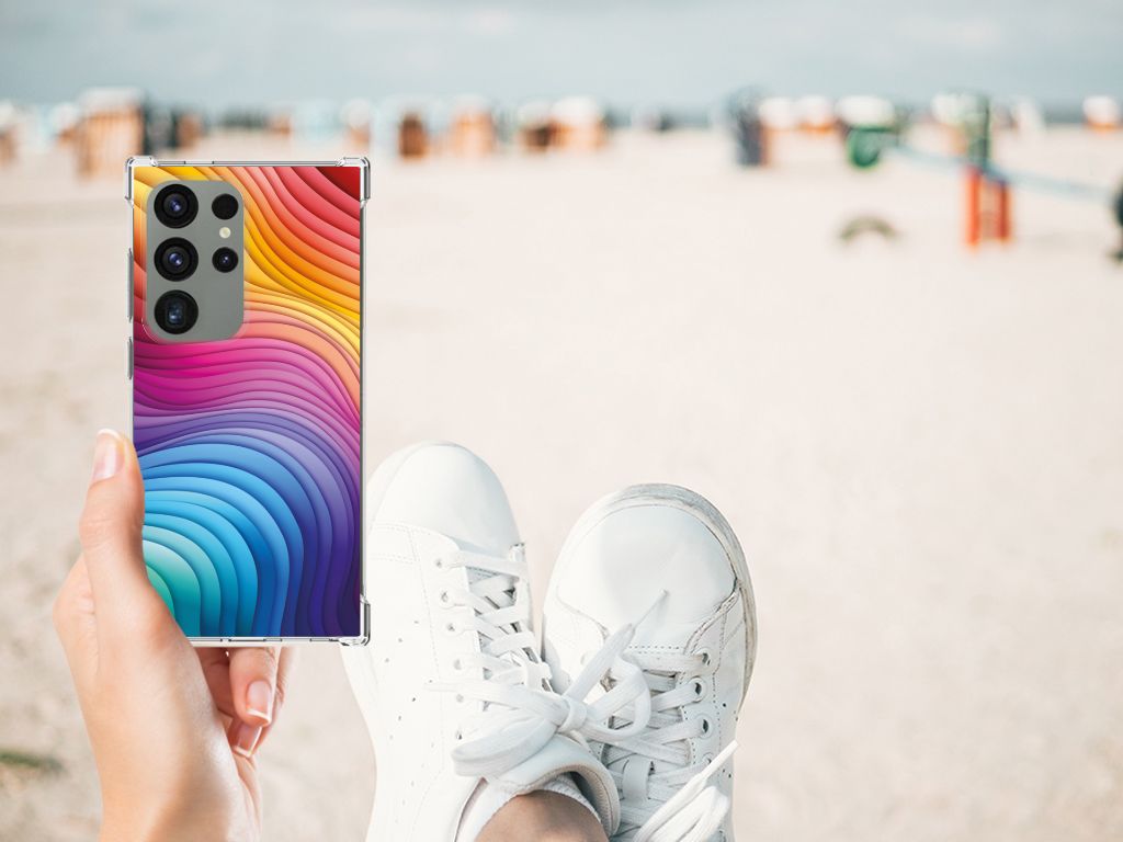 Een regenboog bestaat eigenlijk uit meer dan zeven kleuren, wist je dat? De zichtbare kleuren vloeien geleidelijk in elkaar over, waardoor er eigenlijk meer dan zeven kleuren zijn. Dat wij maar zeven ‘’stroken’’ licht zien, is dus eigenlijk gezichtsbedrog. Toch noemen wij dit hoesje regenboog, omdat wij er blij van worden! Dit design wordt geprint op een Shockproof Case speciaal op maat gemaakt voor de Samsung Galaxy S24 Ultra. Ook fijn zijn de extra dikke hoeken en randen, waardoor je smartphone goed beschermd is bij een val. Alleen de achterkant van je telefoon wordt beschermd. Daarom adviseren wij om dit hoesje in combinatie met een screenprotector te gebruiken. Bestel vandaag nog dit telefoonhoesje met regenboog design!