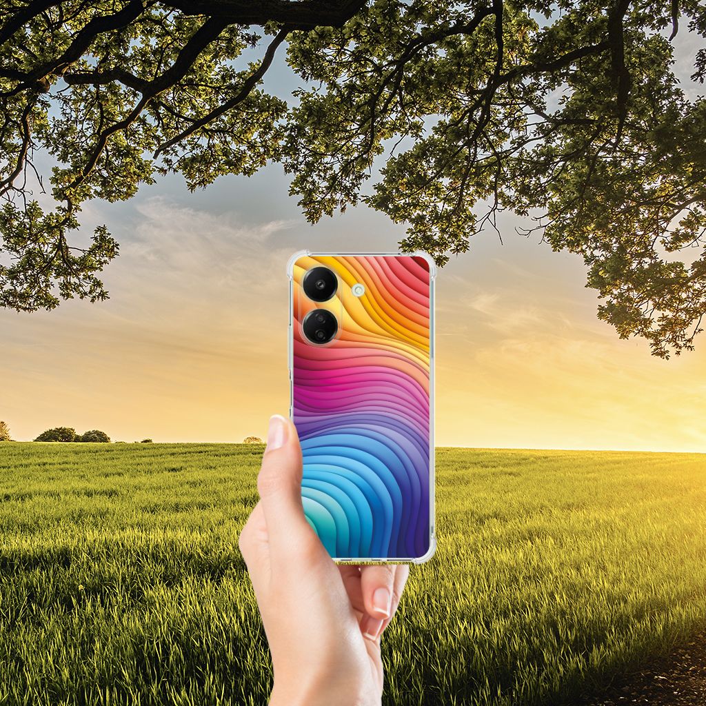 Een regenboog bestaat eigenlijk uit meer dan zeven kleuren, wist je dat? De zichtbare kleuren vloeien geleidelijk in elkaar over, waardoor er eigenlijk meer dan zeven kleuren zijn. Dat wij maar zeven ‘’stroken’’ licht zien, is dus eigenlijk gezichtsbedrog. Toch noemen wij dit hoesje regenboog, omdat wij er blij van worden! Dit design wordt geprint op een Shockproof Case speciaal op maat gemaakt voor de Xiaomi Redmi 13C 4G. Ook fijn zijn de extra dikke hoeken en randen, waardoor je smartphone goed beschermd is bij een val. Alleen de achterkant van je telefoon wordt beschermd. Daarom adviseren wij om dit hoesje in combinatie met een screenprotector te gebruiken. Bestel vandaag nog dit telefoonhoesje met regenboog design!