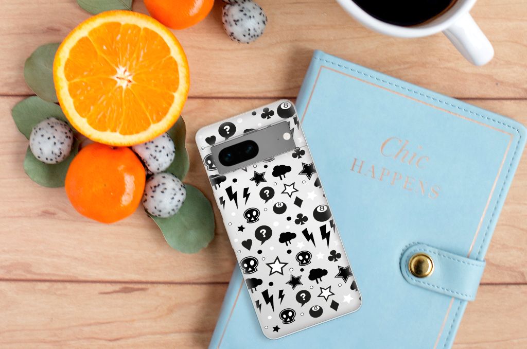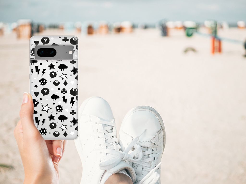 Bliksemflitsen, donderwolken, sterren en biljartballen vliegen op je af als je deze Google Pixel 7 Silicone Back Case koopt. Het bijzondere Silver Punk design is van onze eigen ontwerper en vind je in geen enkel andere winkel of webshop. Ben je fan van dit soort stoere en opvallende hoesjes, dan kun je je geluk niet op als je ons assortiment smartphone accessoires bekijkt. Dit zeer flexibele smartphone hoesje heeft alle nodige uitsparingen en past altijd in je broekzak. De tpu case is aan de bovenkant bedrukt met bliksemflitsen, donderwolken, sterren en biljartballen, de randen blijven transparant. Het TPU is onbreekbaar. Zelfs doodshoofdjes zie je voorbijkomen in het design. Om maar aan te geven dat je met dit zilveren hoesje een krachtige smartphone accessoire te pakken hebt.