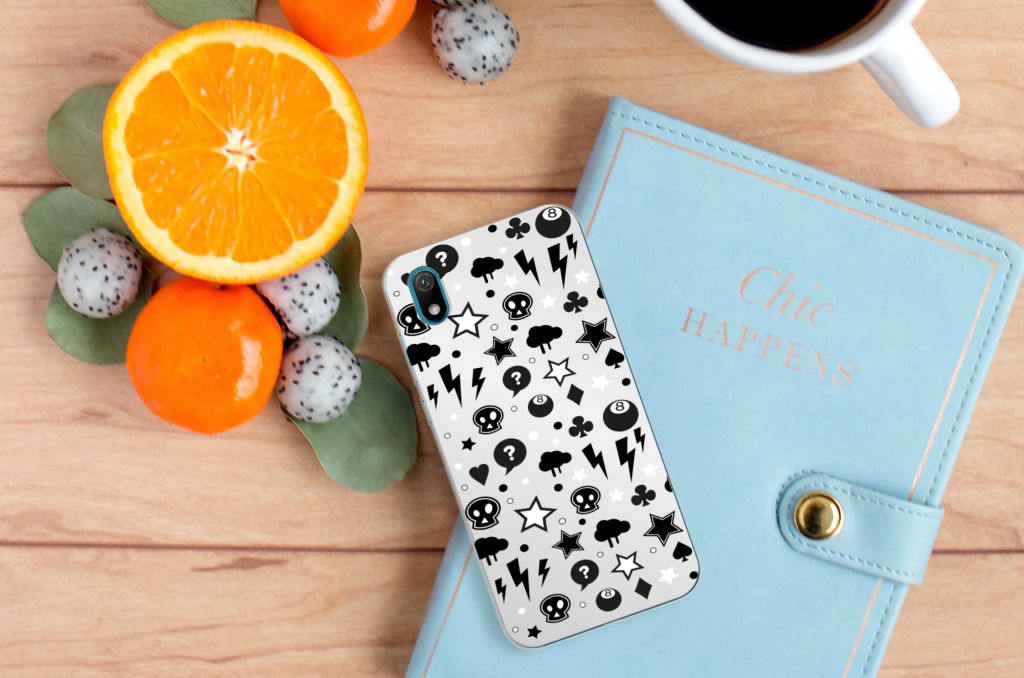 Bliksemflitsen, donderwolken, sterren en biljartballen vliegen op je af als je deze Huawei Y5 (2019) Silicone Back Case koopt. Het bijzondere Silver Punk design is van onze eigen ontwerper en vind je in geen enkel andere winkel of webshop. Ben je fan van dit soort stoere en opvallende hoesjes, dan kun je je geluk niet op als je ons assortiment smartphone accessoires bekijkt. Dit zeer flexibele smartphone hoesje heeft alle nodige uitsparingen en past altijd in je broekzak. De tpu case is aan de bovenkant bedrukt met bliksemflitsen, donderwolken, sterren en biljartballen, de randen blijven transparant. Het TPU is onbreekbaar. Zelfs doodshoofdjes zie je voorbijkomen in het design. Om maar aan te geven dat je met dit zilveren hoesje een krachtige smartphone accessoire te pakken hebt.