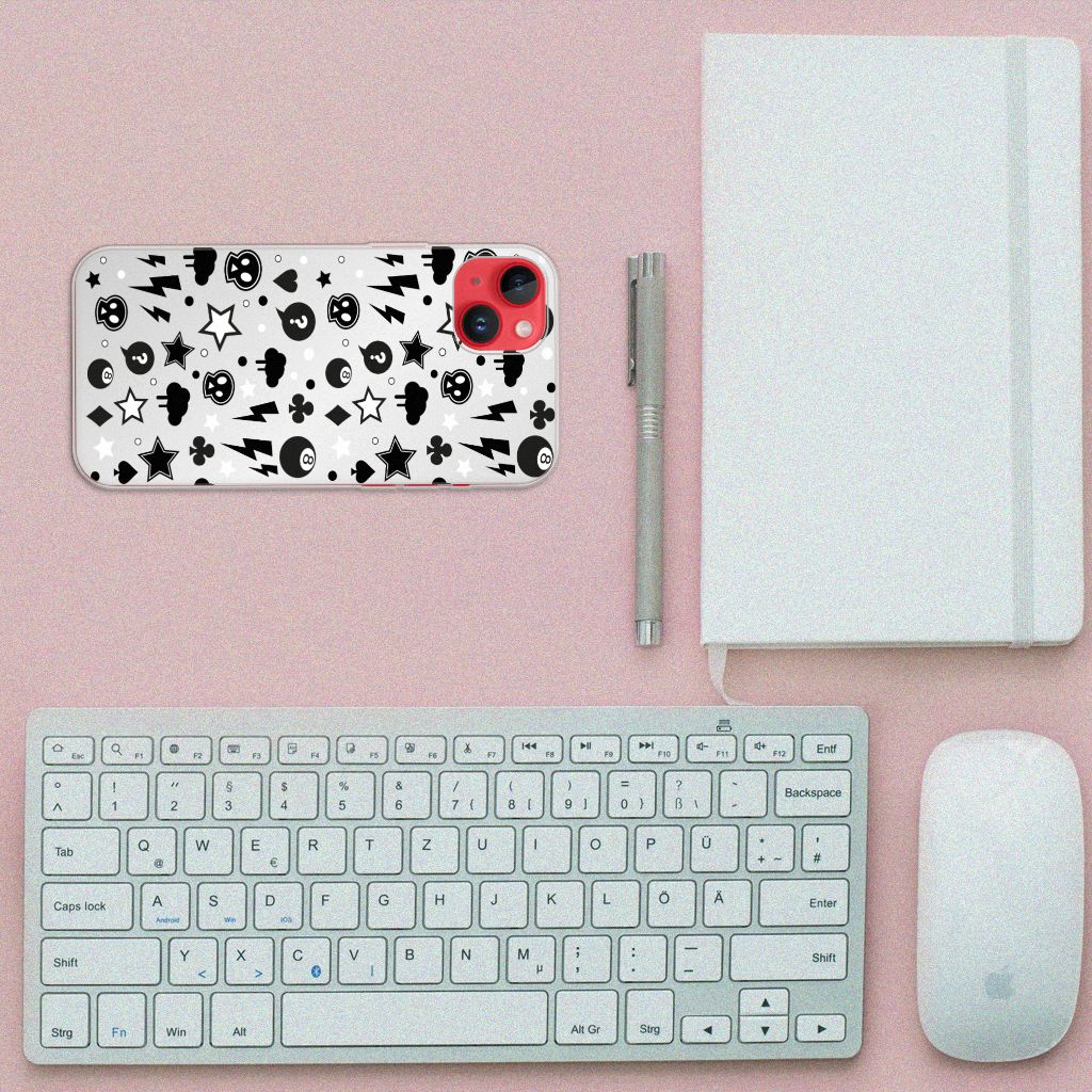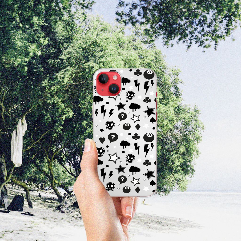 Bliksemflitsen, donderwolken, sterren en biljartballen vliegen op je af als je deze iPhone 14 Plus Silicone Back Case koopt. Het bijzondere Silver Punk design is van onze eigen ontwerper en vind je in geen enkel andere winkel of webshop. Ben je fan van dit soort stoere en opvallende hoesjes, dan kun je je geluk niet op als je ons assortiment smartphone accessoires bekijkt. Dit zeer flexibele smartphone hoesje heeft alle nodige uitsparingen en past altijd in je broekzak. De tpu case is aan de bovenkant bedrukt met bliksemflitsen, donderwolken, sterren en biljartballen, de randen blijven transparant. Het TPU is onbreekbaar. Zelfs doodshoofdjes zie je voorbijkomen in het design. Om maar aan te geven dat je met dit zilveren hoesje een krachtige smartphone accessoire te pakken hebt.