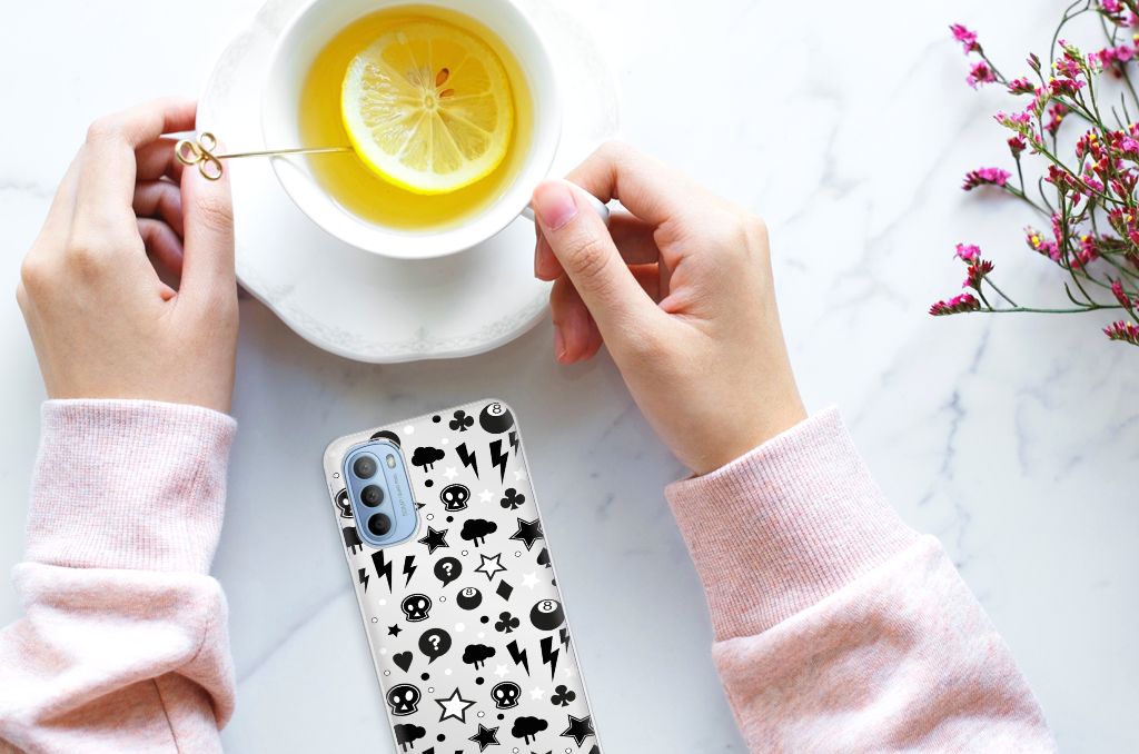 Bliksemflitsen, donderwolken, sterren en biljartballen vliegen op je af als je deze Motorola Moto G31 | G41 Silicone Back Case koopt. Het bijzondere Silver Punk design is van onze eigen ontwerper en vind je in geen enkel andere winkel of webshop. Ben je fan van dit soort stoere en opvallende hoesjes, dan kun je je geluk niet op als je ons assortiment smartphone accessoires bekijkt. Dit zeer flexibele smartphone hoesje heeft alle nodige uitsparingen en past altijd in je broekzak. De tpu case is aan de bovenkant bedrukt met bliksemflitsen, donderwolken, sterren en biljartballen, de randen blijven transparant. Het TPU is onbreekbaar. Zelfs doodshoofdjes zie je voorbijkomen in het design. Om maar aan te geven dat je met dit zilveren hoesje een krachtige smartphone accessoire te pakken hebt.