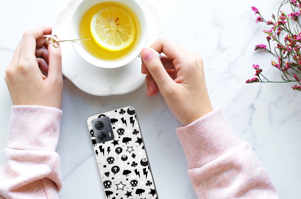 Bliksemflitsen, donderwolken, sterren en biljartballen vliegen op je af als je deze Motorola Moto G53 Silicone Back Case koopt. Het bijzondere Silver Punk design is van onze eigen ontwerper en vind je in geen enkel andere winkel of webshop. Ben je fan van dit soort stoere en opvallende hoesjes, dan kun je je geluk niet op als je ons assortiment smartphone accessoires bekijkt. Dit zeer flexibele smartphone hoesje heeft alle nodige uitsparingen en past altijd in je broekzak. De tpu case is aan de bovenkant bedrukt met bliksemflitsen, donderwolken, sterren en biljartballen, de randen blijven transparant. Het TPU is onbreekbaar. Zelfs doodshoofdjes zie je voorbijkomen in het design. Om maar aan te geven dat je met dit zilveren hoesje een krachtige smartphone accessoire te pakken hebt.