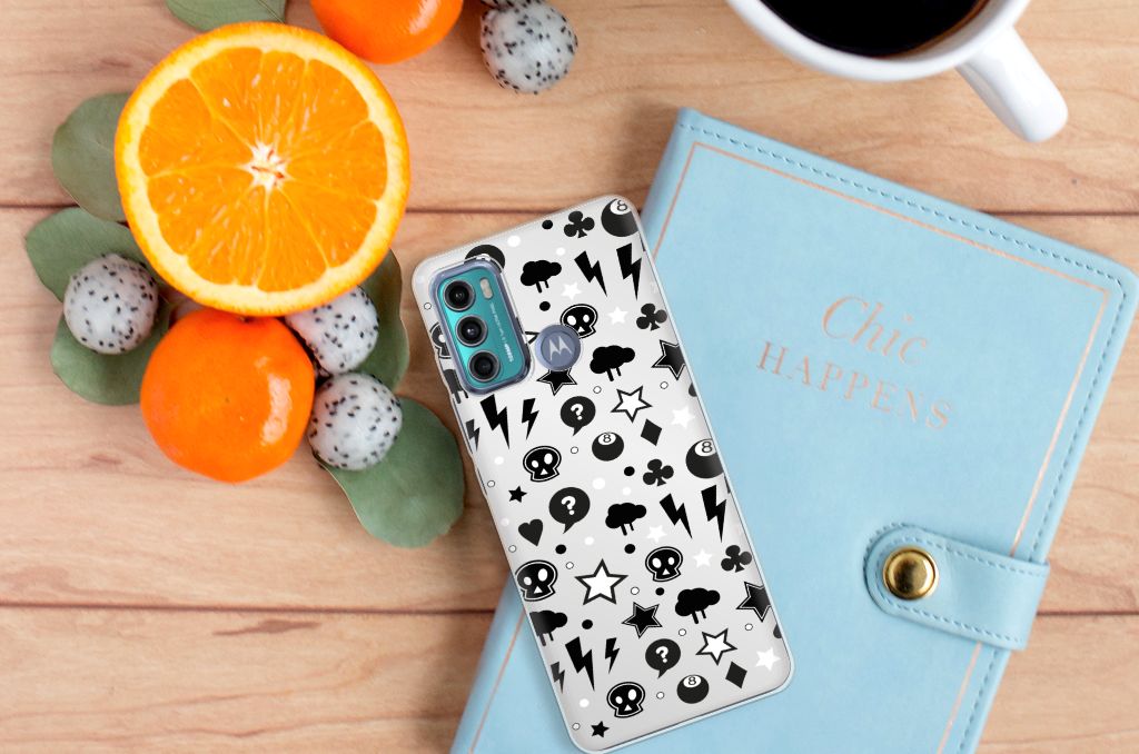 Bliksemflitsen, donderwolken, sterren en biljartballen vliegen op je af als je deze Motorola Moto G60 Silicone Back Case koopt. Het bijzondere Silver Punk design is van onze eigen ontwerper en vind je in geen enkel andere winkel of webshop. Ben je fan van dit soort stoere en opvallende hoesjes, dan kun je je geluk niet op als je ons assortiment smartphone accessoires bekijkt. Dit zeer flexibele smartphone hoesje heeft alle nodige uitsparingen en past altijd in je broekzak. De tpu case is aan de bovenkant bedrukt met bliksemflitsen, donderwolken, sterren en biljartballen, de randen blijven transparant. Het TPU is onbreekbaar. Zelfs doodshoofdjes zie je voorbijkomen in het design. Om maar aan te geven dat je met dit zilveren hoesje een krachtige smartphone accessoire te pakken hebt.