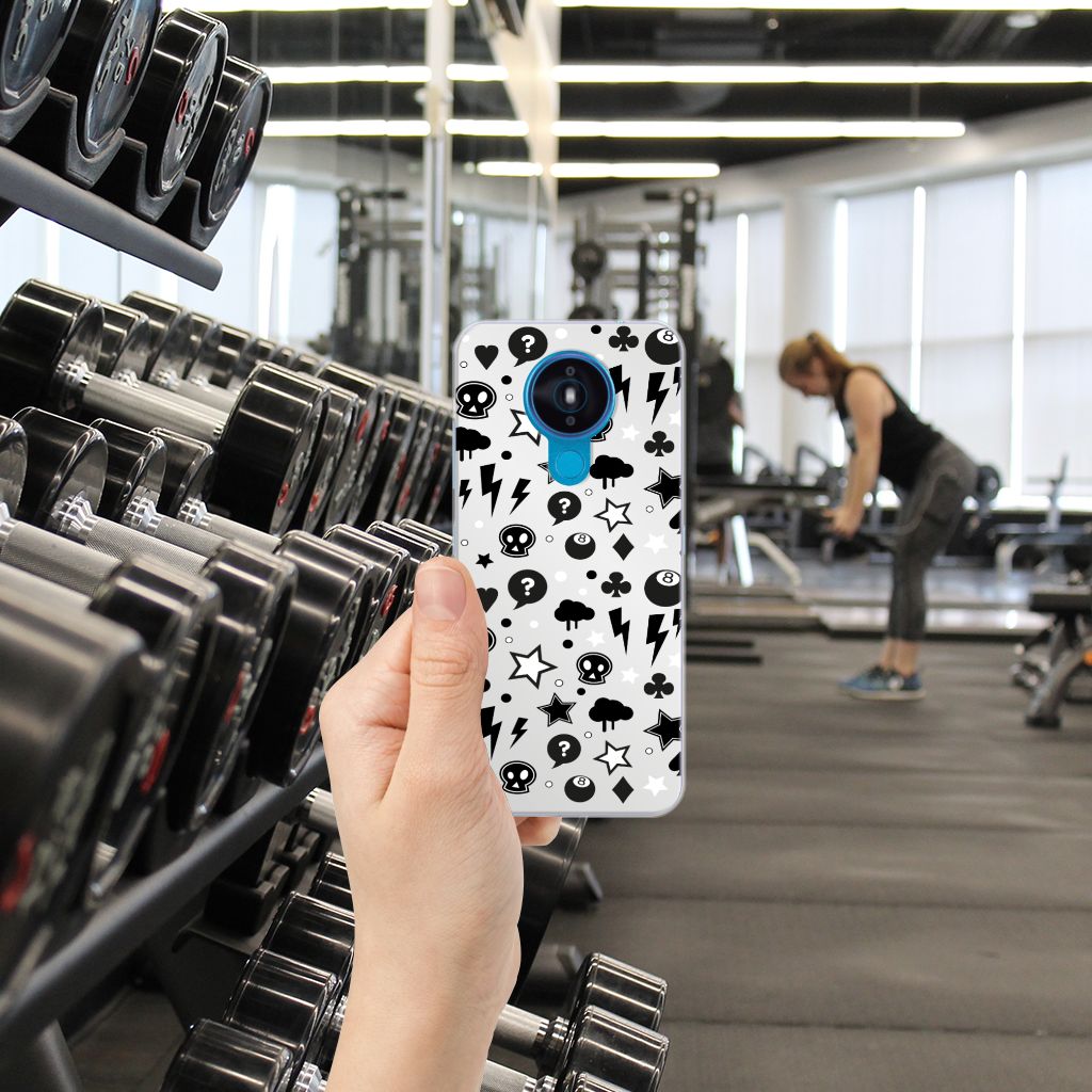 Bliksemflitsen, donderwolken, sterren en biljartballen vliegen op je af als je deze Nokia 1.4 Silicone Back Case koopt. Het bijzondere Silver Punk design is van onze eigen ontwerper en vind je in geen enkel andere winkel of webshop. Ben je fan van dit soort stoere en opvallende hoesjes, dan kun je je geluk niet op als je ons assortiment smartphone accessoires bekijkt. Dit zeer flexibele smartphone hoesje heeft alle nodige uitsparingen en past altijd in je broekzak. De tpu case is aan de bovenkant bedrukt met bliksemflitsen, donderwolken, sterren en biljartballen, de randen blijven transparant. Het TPU is onbreekbaar. Zelfs doodshoofdjes zie je voorbijkomen in het design. Om maar aan te geven dat je met dit zilveren hoesje een krachtige smartphone accessoire te pakken hebt.