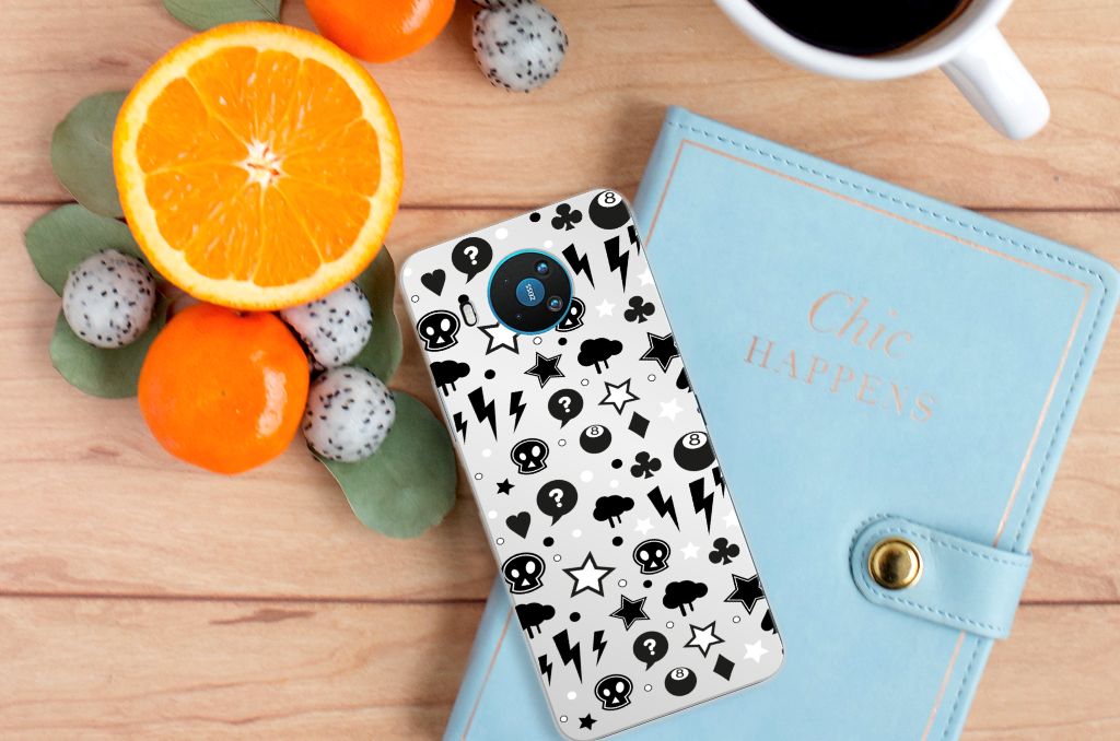 Bliksemflitsen, donderwolken, sterren en biljartballen vliegen op je af als je deze Nokia 8.3 Silicone Back Case koopt. Het bijzondere Silver Punk design is van onze eigen ontwerper en vind je in geen enkel andere winkel of webshop. Ben je fan van dit soort stoere en opvallende hoesjes, dan kun je je geluk niet op als je ons assortiment smartphone accessoires bekijkt. Dit zeer flexibele smartphone hoesje heeft alle nodige uitsparingen en past altijd in je broekzak. De tpu case is aan de bovenkant bedrukt met bliksemflitsen, donderwolken, sterren en biljartballen, de randen blijven transparant. Het TPU is onbreekbaar. Zelfs doodshoofdjes zie je voorbijkomen in het design. Om maar aan te geven dat je met dit zilveren hoesje een krachtige smartphone accessoire te pakken hebt.