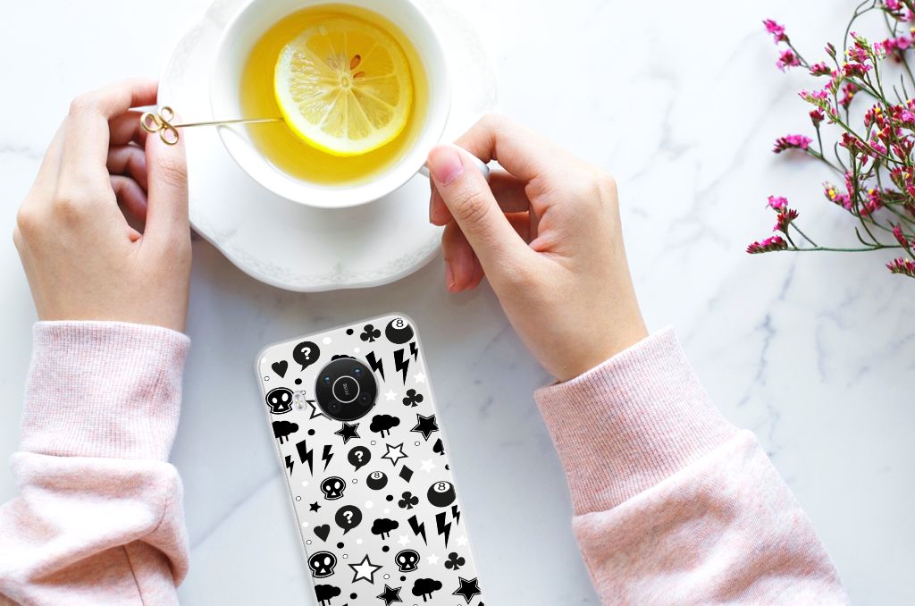 Bliksemflitsen, donderwolken, sterren en biljartballen vliegen op je af als je deze Nokia X10 | X20 Silicone Back Case koopt. Het bijzondere Silver Punk design is van onze eigen ontwerper en vind je in geen enkel andere winkel of webshop. Ben je fan van dit soort stoere en opvallende hoesjes, dan kun je je geluk niet op als je ons assortiment smartphone accessoires bekijkt. Dit zeer flexibele smartphone hoesje heeft alle nodige uitsparingen en past altijd in je broekzak. De tpu case is aan de bovenkant bedrukt met bliksemflitsen, donderwolken, sterren en biljartballen, de randen blijven transparant. Het TPU is onbreekbaar. Zelfs doodshoofdjes zie je voorbijkomen in het design. Om maar aan te geven dat je met dit zilveren hoesje een krachtige smartphone accessoire te pakken hebt.