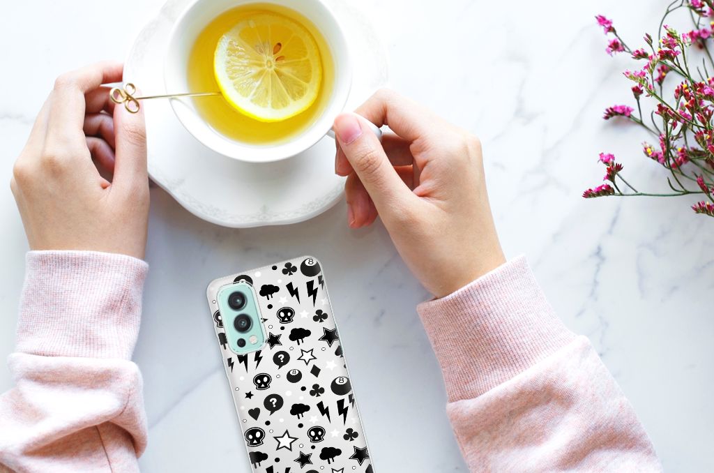 Bliksemflitsen, donderwolken, sterren en biljartballen vliegen op je af als je deze OnePlus Nord 2 5G Silicone Back Case koopt. Het bijzondere Silver Punk design is van onze eigen ontwerper en vind je in geen enkel andere winkel of webshop. Ben je fan van dit soort stoere en opvallende hoesjes, dan kun je je geluk niet op als je ons assortiment smartphone accessoires bekijkt. Dit zeer flexibele smartphone hoesje heeft alle nodige uitsparingen en past altijd in je broekzak. De tpu case is aan de bovenkant bedrukt met bliksemflitsen, donderwolken, sterren en biljartballen, de randen blijven transparant. Het TPU is onbreekbaar. Zelfs doodshoofdjes zie je voorbijkomen in het design. Om maar aan te geven dat je met dit zilveren hoesje een krachtige smartphone accessoire te pakken hebt.