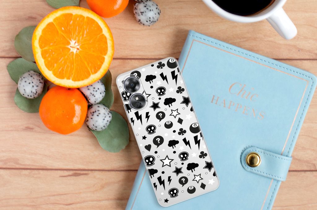 Bliksemflitsen, donderwolken, sterren en biljartballen vliegen op je af als je deze OPPO A17 Silicone Back Case koopt. Het bijzondere Silver Punk design is van onze eigen ontwerper en vind je in geen enkel andere winkel of webshop. Ben je fan van dit soort stoere en opvallende hoesjes, dan kun je je geluk niet op als je ons assortiment smartphone accessoires bekijkt. Dit zeer flexibele smartphone hoesje heeft alle nodige uitsparingen en past altijd in je broekzak. De tpu case is aan de bovenkant bedrukt met bliksemflitsen, donderwolken, sterren en biljartballen, de randen blijven transparant. Het TPU is onbreekbaar. Zelfs doodshoofdjes zie je voorbijkomen in het design. Om maar aan te geven dat je met dit zilveren hoesje een krachtige smartphone accessoire te pakken hebt.