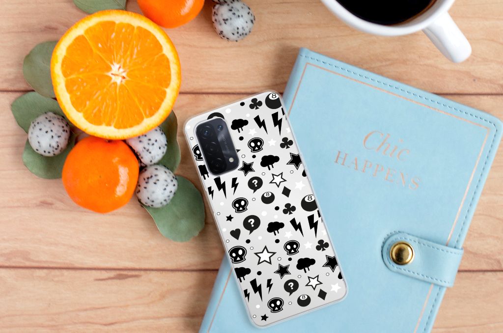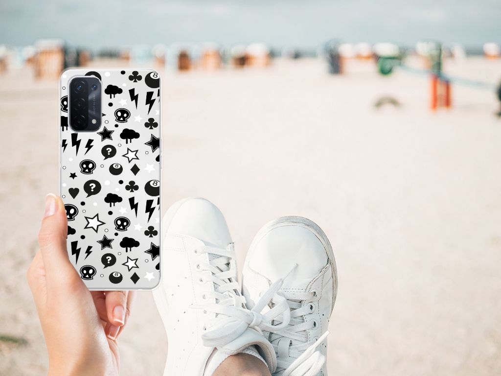 Bliksemflitsen, donderwolken, sterren en biljartballen vliegen op je af als je deze OPPO A93 5G Silicone Back Case koopt. Het bijzondere Silver Punk design is van onze eigen ontwerper en vind je in geen enkel andere winkel of webshop. Ben je fan van dit soort stoere en opvallende hoesjes, dan kun je je geluk niet op als je ons assortiment smartphone accessoires bekijkt. Dit zeer flexibele smartphone hoesje heeft alle nodige uitsparingen en past altijd in je broekzak. De tpu case is aan de bovenkant bedrukt met bliksemflitsen, donderwolken, sterren en biljartballen, de randen blijven transparant. Het TPU is onbreekbaar. Zelfs doodshoofdjes zie je voorbijkomen in het design. Om maar aan te geven dat je met dit zilveren hoesje een krachtige smartphone accessoire te pakken hebt.