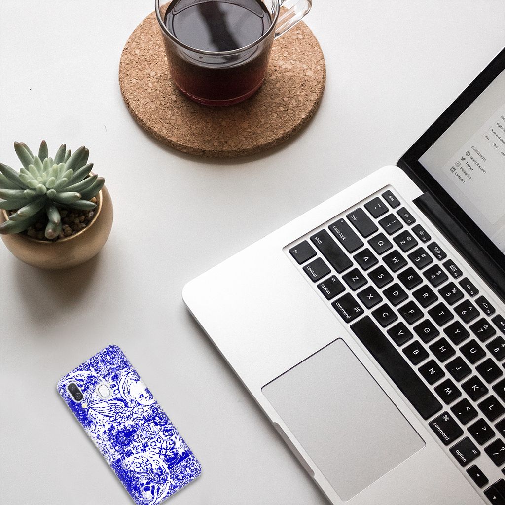 Dit ietwat duistere blauwe patroon tref je vaak aan op een bandana. Een bandana wordt om het hoofd of de hals gedragen. Een bandana is ideaal als je op de racefiets, motor of de brommer zit en jezelf wilt beschermen tegen wind, opwaaiend stof of fijn zand. Leden van motorclubs dragen dit soort bandana’s dan ook graag. Wil je jouw Samsung Galaxy A40 optimaal beschermen tegen opwaaiend stof, zand of andere bedreigingen, dan is dit design hoesje met Angel Skull Blue design een zeer goede keus. Het design staat op een TPU case. Dit Silicone Back Case wordt alleen aan de bovenkant bedrukt en is zeer flexibel. De randen van het hoesje blijven transparant en worden niet bedrukt. Met dit hoesje past jouw telefoon altijd in je broekzak.