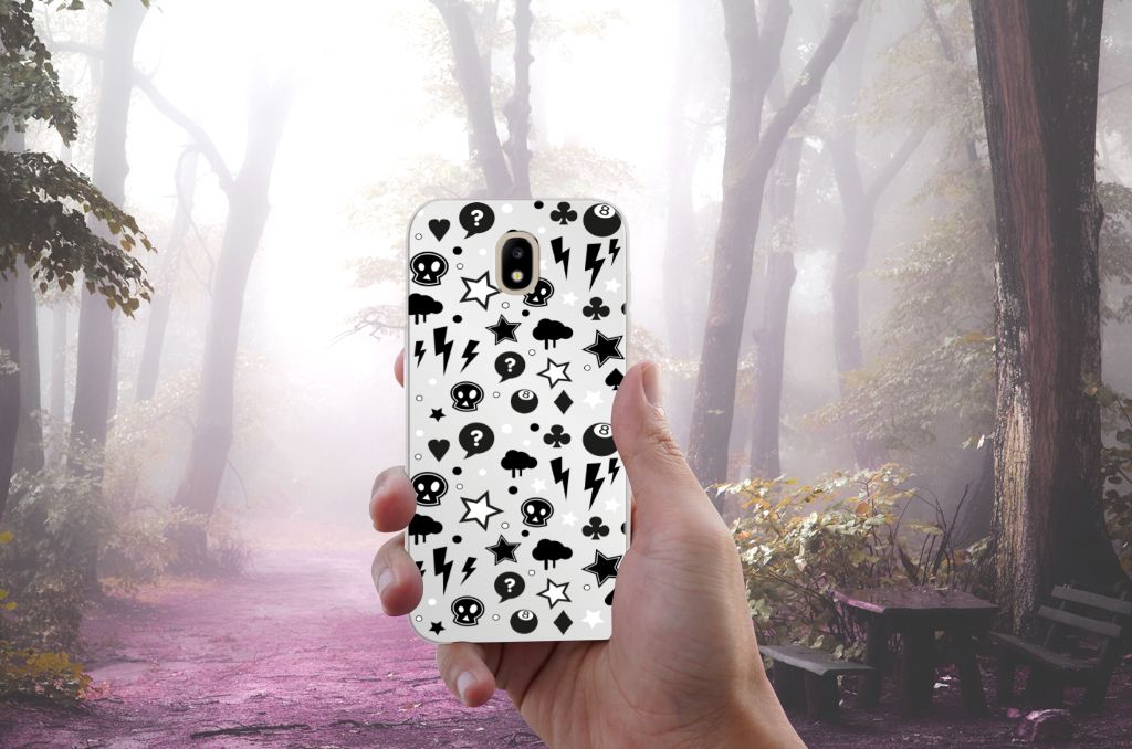 Bliksemflitsen, donderwolken, sterren en biljartballen vliegen op je af als je deze Samsung Galaxy J5 2017 Silicone Back Case koopt. Het bijzondere Silver Punk design is van onze eigen ontwerper en vind je in geen enkel andere winkel of webshop. Ben je fan van dit soort stoere en opvallende hoesjes, dan kun je je geluk niet op als je ons assortiment smartphone accessoires bekijkt. Dit zeer flexibele smartphone hoesje heeft alle nodige uitsparingen en past altijd in je broekzak. De tpu case is aan de bovenkant bedrukt met bliksemflitsen, donderwolken, sterren en biljartballen, de randen blijven transparant. Het TPU is onbreekbaar. Zelfs doodshoofdjes zie je voorbijkomen in het design. Om maar aan te geven dat je met dit zilveren hoesje een krachtige smartphone accessoire te pakken hebt.