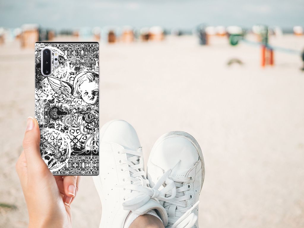 Dit mysterieuze patroon tref je vaak aan op een bandana. Een bandana is een kledingstuk dat om het hoofd of de hals wordt gedragen. Behalve als kledingstuk vindt de bandana soms toepassing als signaal. Een bandana is het eenvoudigste middel als je op de motor of de brommer zit en jezelf wilt beschermen tegen wind, opwaaiend stof of fijn zand. Leden van bekende motorclubs dragen dit kledingstuk dan ook graag, om meerdere redenen. Wil je jouw Samsung Galaxy Note 10 Plus optimaal beschermen tegen opwaaiend stof, zand of andere bedreigingen, dan is dit design hoesje met Skulls Angel een zeer goede keus. Het design staat op een TPU case. Dit Silicone Back Case wordt alleen aan de bovenkant bedrukt en is zeer flexibel. De randen van het hoesje blijven transparant en worden niet bedrukt. Met dit hoesje past jouw telefoon altijd in je broekzak.