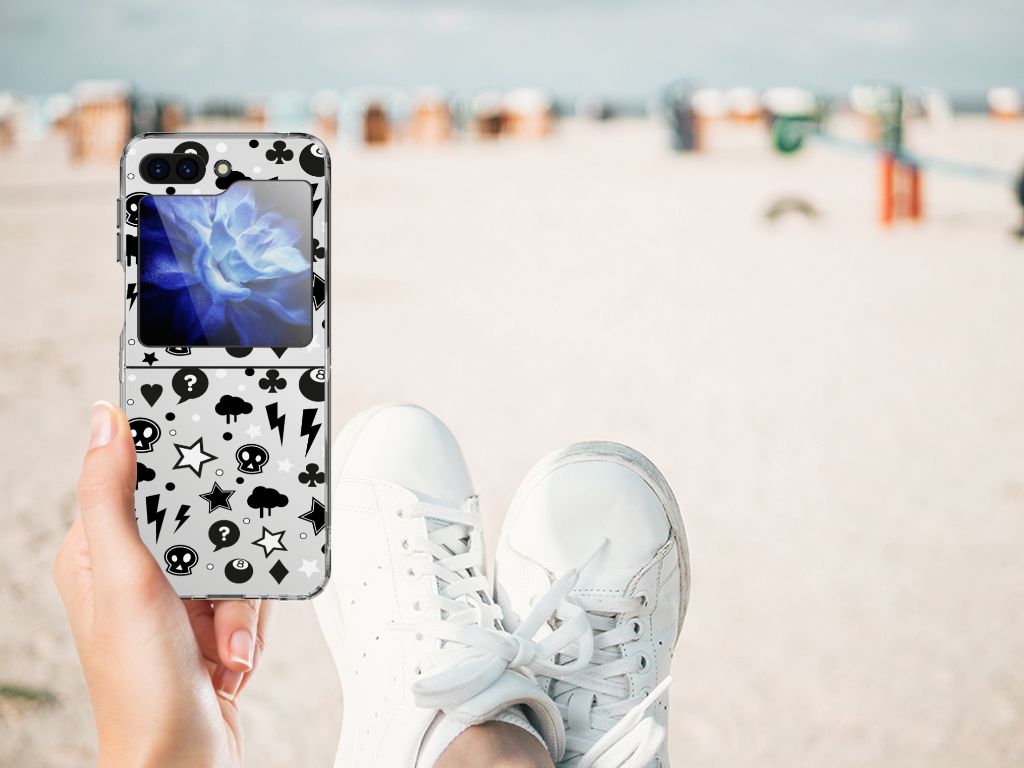 Bliksemflitsen, donderwolken, sterren en biljartballen vliegen op je af als je deze Samsung Galaxy Z Flip 5 Silicone Back Case koopt. Het bijzondere Silver Punk design is van onze eigen ontwerper en vind je in geen enkel andere winkel of webshop. Ben je fan van dit soort stoere en opvallende hoesjes, dan kun je je geluk niet op als je ons assortiment smartphone accessoires bekijkt. Dit zeer flexibele smartphone hoesje heeft alle nodige uitsparingen en past altijd in je broekzak. De tpu case is aan de bovenkant bedrukt met bliksemflitsen, donderwolken, sterren en biljartballen, de randen blijven transparant. Het TPU is onbreekbaar. Zelfs doodshoofdjes zie je voorbijkomen in het design. Om maar aan te geven dat je met dit zilveren hoesje een krachtige smartphone accessoire te pakken hebt.