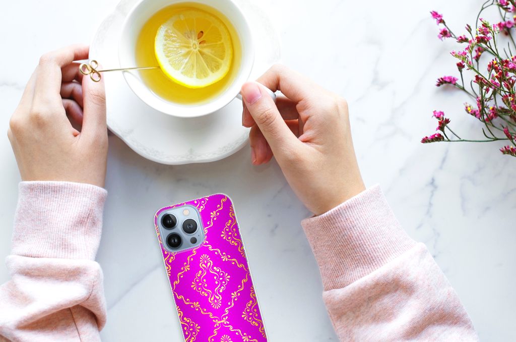 Dit super mooie Apple iPhone 13 Pro Siliconen Hoesje met Barok Roze achtergrond is een geweldige en duurzame bescherming voor jouw smartphone. De roze kleuren en figuren worden met de grootst mogelijke zorg op het hoesje gezet en op de achterkant bedrukt. Dit drukwerk doen we in ons eigen magazijn, zodat we de kwaliteit van het tpu hoesje met roze barok achtergrond kunnen garanderen. Een tpu hoesje is perfect op maat gemaakt en heeft een mooie uitstraling. Daarnaast is de case zeer flexibel en het materiaal onbreekbaar. De case heeft opstaande randen ter bescherming van het scherm. De randen van het tpu hoesje worden niet in roze barok bedrukt. Nergens anders tref je een tpu hoesje met roze barok achtergrond aan dat zo goed past bij jouw smartphone.