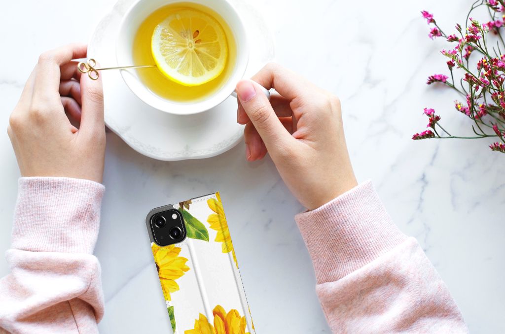 Een zonnebloem is niet alleen mooi, maar ook nog eens slim. Wist je dat de bloem draait naar de kant waar de zon schijnt? Daarom staat de zonnebloem voor veel mensen symbool voor de zomer. Wat ons betreft schijnt de zon altijd met dit mooie zonnebloemen hoesje voor jouw iPhone 13 Mini. Dit zonnige zonnebloemen design wordt geprint op een Smart Cover waarin je een pasje kwijt kunt. Vouw het hoesje om en zet het horizontaal neer voor als je graag filmpjes op je iPhone 13 Mini kijkt. De magneten aan de binnenkant zorgen ervoor dat het hoesje dicht blijft in bijv. je tas. Bestel vandaag nog dit Zonnebloemen design hoesje voor je smartphone.