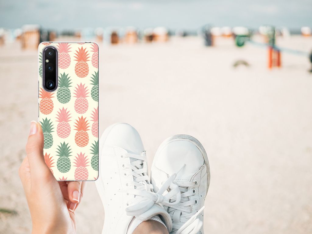 Ananas is een woord uit het Tupi, de taal van de Tupi-indianen, en betekent uitmuntende vrucht. Dit fruit van zeer hoge kwaliteit staat op onze superieure boekhoesjes, stand cases, hard cases en TPU cases. Jij blijft er gezond uitzien als je zo nu en dan een hap neemt van een Ananas , jouw smartphone blijft tip top in orde als je er een leuk telefoonhoesje omheen doet. Een ananas heeft stevig, veerkrachtig vruchtvlees. Een beetje te vergelijken met het TPU in onze hoesjes. TPU is elastisch materiaal, dat zeer buigzaam is. Vandaar dat het zeer schokbestendig is. Het ananas design staat op een staat op een TPU case. Deze Sony Xperia 1 V Siliconen Case wordt alleen aan de bovenkant bedrukt en is zeer flexibel. De randen van het hoesje blijven transparant.