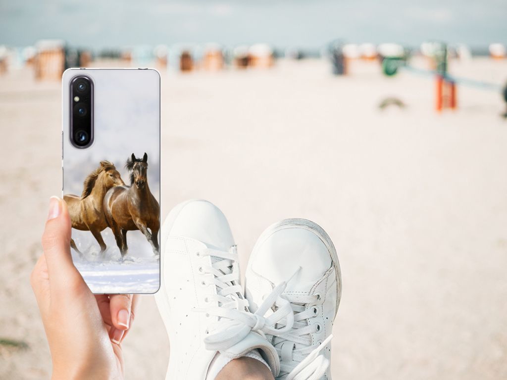 Voor de paardenliefhebbers onder ons hebben we onze collectie uitgebreid met dit design hoesje met print van paarden. Vroeger hield de mens vooral werkpaarden, inmiddels hebben we vriendschap gesloten met het paard. Vandaar dat het ook een favoriet dier is op onze smartphonehoesjes, zoals deze tpu case. Een TPU Hoesje voor de Sony Xperia 1 V met Paarden is niet alleen super mooi en chique, maar ook nog eens zeer flexibel. Verder is de case schokabsorberend en heeft het opstaande randen. Zie je liever je eigen paard terug op een hoesje. Dat kan! Door zelf een uniek hoesje te ontwerpen, met eigen foto’s en teksten. De TPU case wordt aan de bovenzijde bedrukt, de zijkanten blijven transparant.