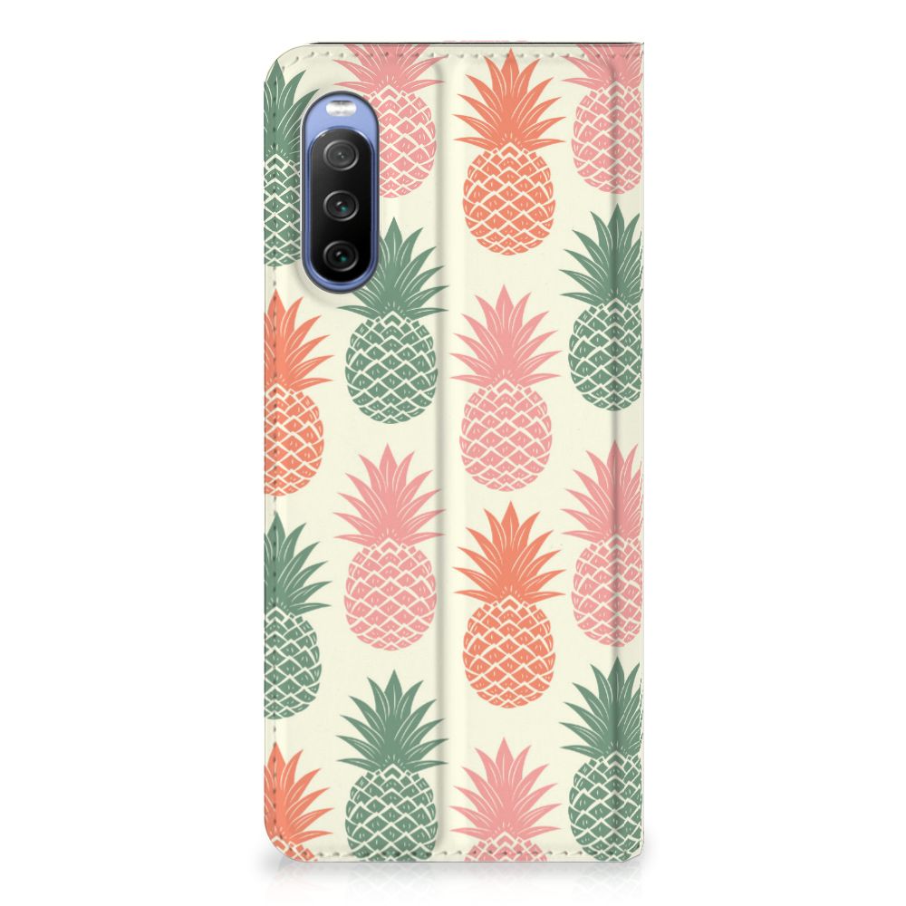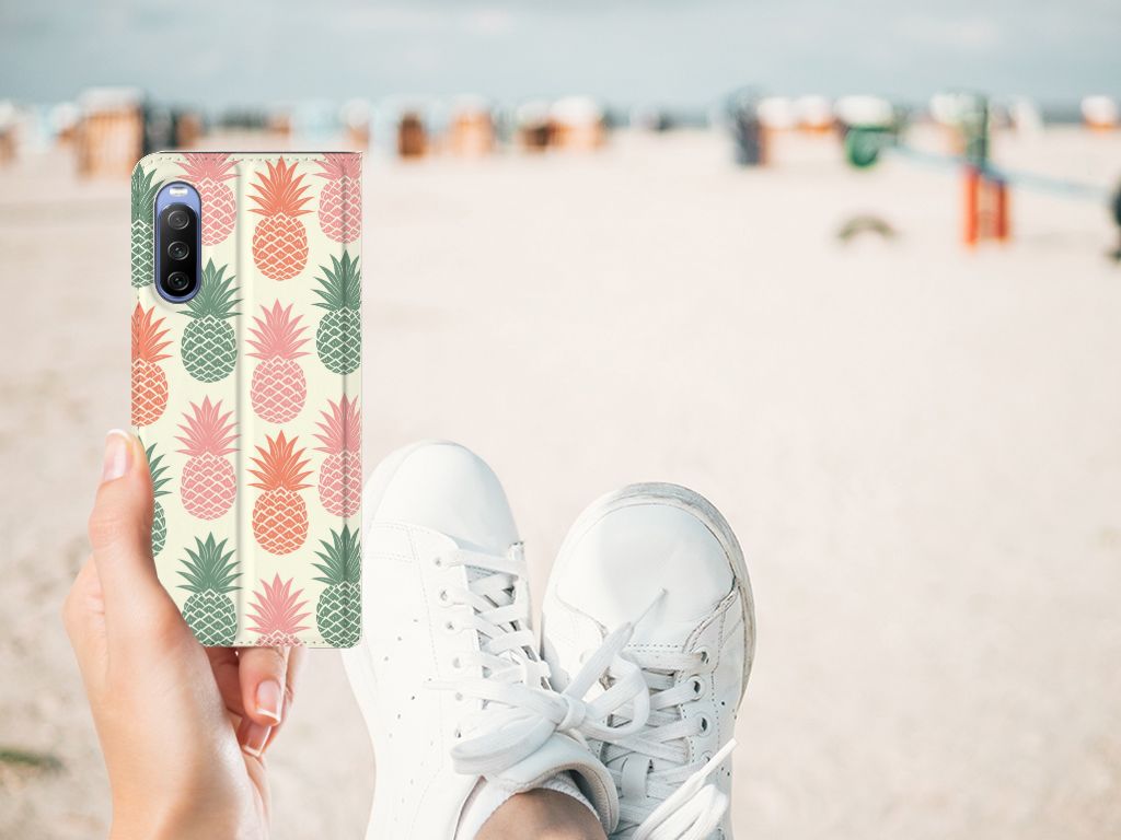 Ananas is een woord uit het Tupi, de taal van de Tupi-indianen, en betekent uitmuntende vrucht. Dit fruit van zeer hoge kwaliteit staat op onze superieure boekhoesjes, stand cases, hard cases en TPU cases. Jij blijft er gezond uitzien als je zo nu en dan een hap neemt van een Ananas , jouw smartphone blijft tip top in orde als je er een leuk telefoonhoesje omheen doet. Een ananas heeft stevig, veerkrachtig vruchtvlees. Een beetje te vergelijken met het TPU in onze hoesjes. TPU is elastisch materiaal, dat zeer buigzaam is. Vandaar dat het zeer schokbestendig is. Het ananas design staat op een stand case. Deze Sony Xperia 10 III Flip Style Cover beschermt jouw telefoon aan alle kanten en beschikt over een 1 opbergvakje en een speciale standaard. Het hoesje wordt afgesloten met een magneet aan de binnenzijde. De houder aan de binnenzijde is van TPU.