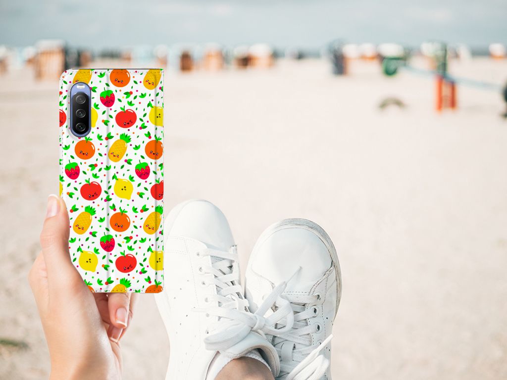Een fris, fruitig en vrolijk hoesje, deze case met afbeeldingen van aardbeien, ananassen, appels, sinaasappels en citroenen. Minstens twee stuks fruit per dag wordt aanbevolen als dagelijkse hoeveelheid voor de mens. Dit verkleint de kans op allerlei ziekten. Dus met het aantal stukken fruit op de Sony Xperia 10 III Flip Style Cover zou je wel een maandje zoet moeten zijn. Met het hoesje zelf kun je je hele leven doen, dit is namelijk niet stuk te krijgen. Dit komt door het sterke en flexibele materiaal waarvan het gemaakt is. De vrolijk stemmende case het desing Fruits maakt jouw telefoon dus zeer duurzaam. Zorg ervoor dat jouw smartphone gezond blijft en kies voor dit hoesje met frivool fruit. Een stand case met fruit beschermt jouw telefoon aan alle kanten en beschikt over een 1 opbergvakje en een speciale standaard. Het hoesje met fruit wordt afgesloten met een magneet aan de binnenzijde. De houder aan de binnenzijde is van TPU.