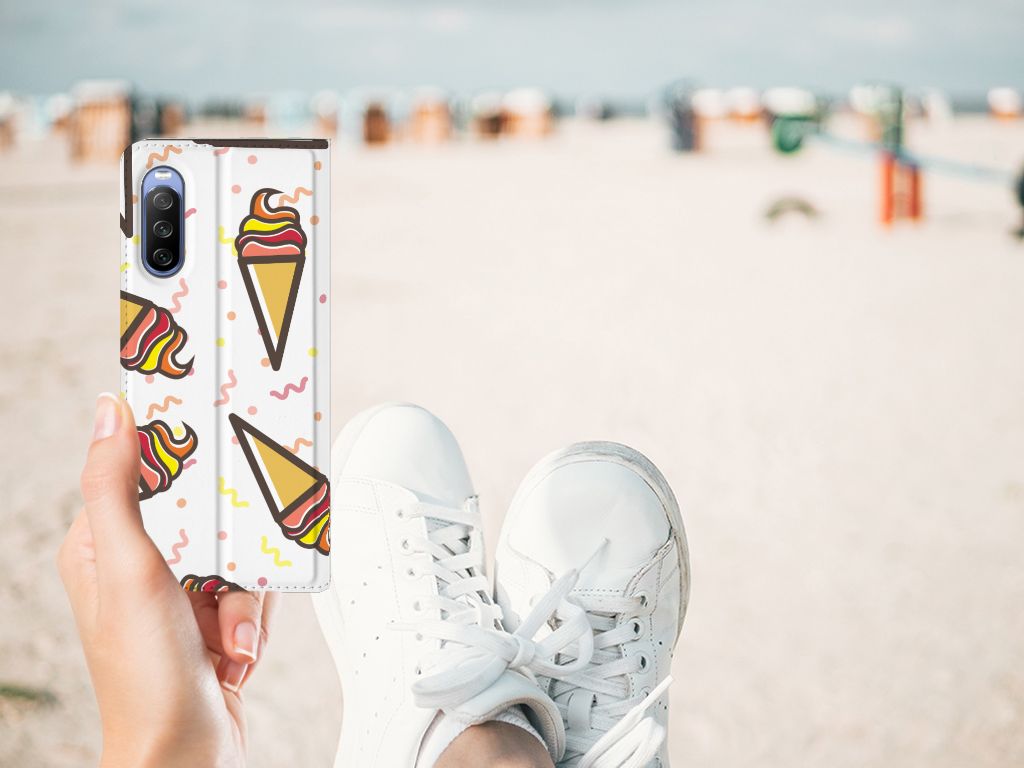 Een vrolijke Sony Xperia 10 III Flip Style Cover met daarop verschillende ijsjes. Als je daar geen zomers gevoel meer van krijgt, weten wij het ook niet meer. De zomer en ijsjes zijn onlosmakelijk met elkaar verbonden. Tijdens een bezoekje aan het strand mag een lekker ijsje bijvoorbeeld niet ontbreken. Een design hoesje met lekkere Icecream print past daar natuurlijk ook ontzettend goed bij. Jouw telefoon is helemaal beschermd met een stand case met ijsjes design. De aankoop van deze case is een heerlijke investering, die zich gegarandeerd terugbetaalt. Alle zijden van dit hoesje worden bedrukt met ijsjes. De case heeft een speciale standaard en de houder aan de binnenzijde is van TPU. Onder alle weersomstandigheden zal deze case met opbergvakje perfect functioneren, ook in de zomer met een ijsje in je hand. Dit smaakvolle hoesje is zeer goedkoop te bestellen en wordt zeer snel bezorgd.