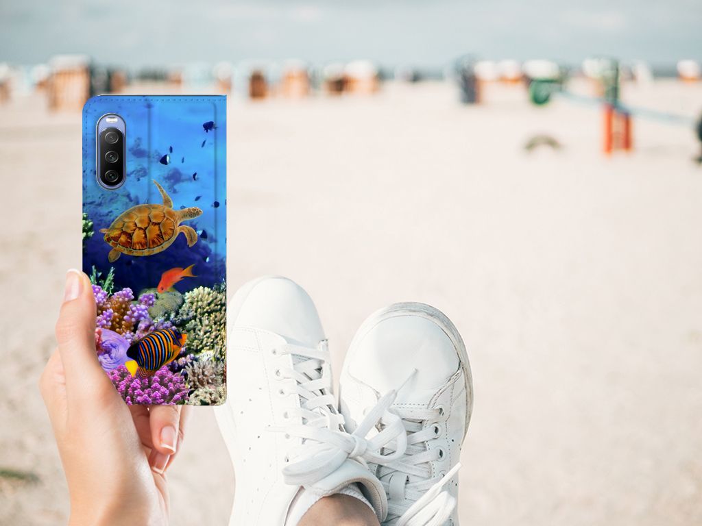 Dit kleurrijke hoesje met tropische Vissen is een ware eyecatcher. Als je aan het duiken bent en je treft een school aan met dit soort opvallende vissen, dan heb je een geweldige ervaring. Maar je hoeft er eigenlijk niet per se het water voor in te duiken. Want wij hebben een schitterende verzameling vissen op dit design hoesje gezet. Met onze zeer geavanceerde printer zetten we de afbeelding van vissen op alle zijden van de Sony Xperia 10 III Hoesje maken. De case heeft aan de binnenkant een vakje waarin je jouw creditcard of ander pasje kwijt kunt. Ga je een dagje vissen, dan hoef je de portemonnee dus ook niet op zak te hebben. Verder is je telefoon natuurlijk maximaal beschermd met deze stand case met print van tropische vissen. De houder aan de binnenzijde van het design hoesje met vissen print is van TPU.