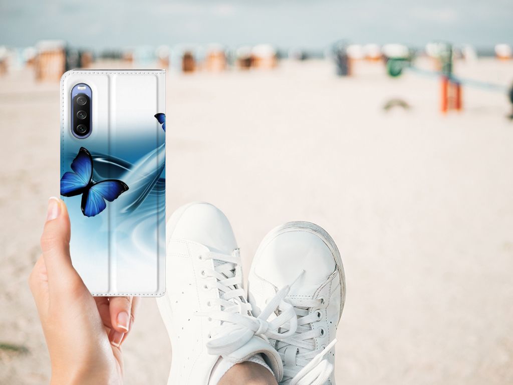 Deze vrolijke Sony Xperia 10 III Hoesje maken met blauwe vlinders is een ware eyecatcher. De meeste vlinders hebben een onopvallende vleugelkleur, andere soorten hebben juist heldere en felle kleuren. Wij kunnen deze blauwe vlinders op een zeer handige stand case zetten. Deze hoesjes zijn het meest gewild. Met onze geavanceerde printer zetten we de afbeelding van vlinders op alle zijden van het hoesje. De case met vlinders heeft aan de binnenkant een houder waarin je jouw creditcard of ander pasje kwijt kunt. De case heeft bovendien een handige standaard. Verder is je telefoon natuurlijk maximaal beschermd met deze stand case met print van blauwe vlinders. De houder aan de binnenzijde van het design hoesje met vlinder print is van TPU.